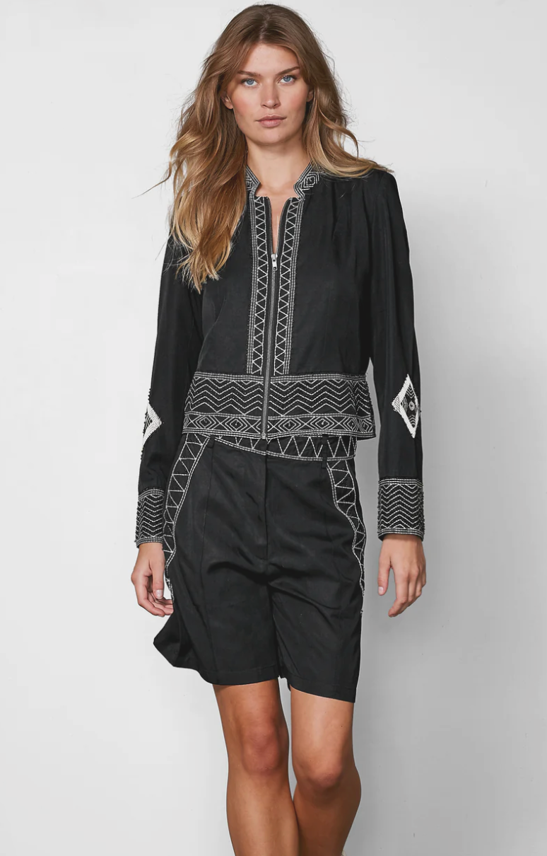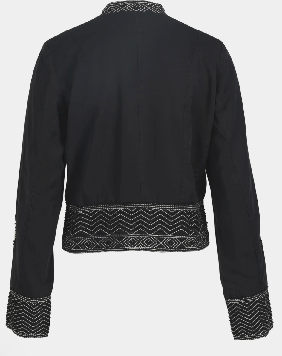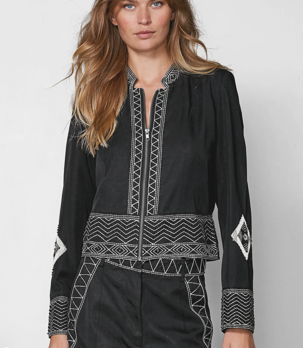 The jacket has a short, straight cut with decorative embroidery along the collar, front edges, cuffs, and bottom edge. The graphic patterns in contrasting colors combined with fine black beads give a handmade and stylish expression. The front zip closure and simple collar add a modern touch to the jacket, while the long sleeves complete the balanced design.