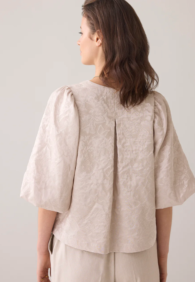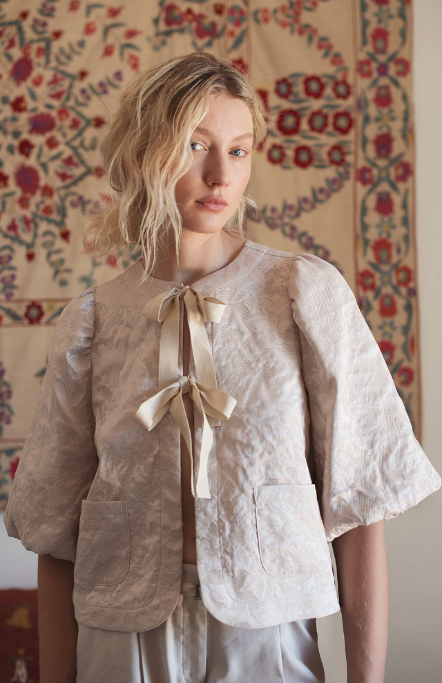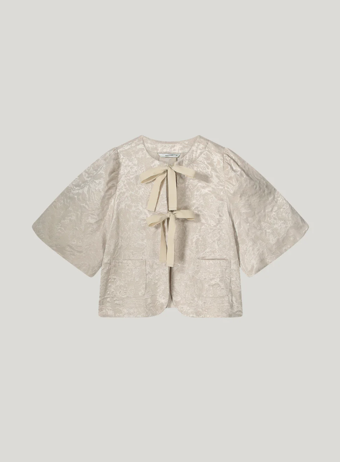 Made of a woven Jacquard fabric, this blouse jacket features short, lined balloon sleeves and a rib-strap bow fastening. The gathering at the back of the sleeves adds an extra balloon effect.