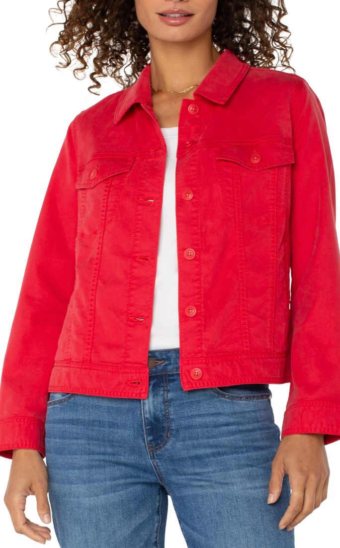 This Trucker Jacket, made with peached twill material, is the perfect addition to your everyday wardrobe. The shirring back adds a flattering touch to its super soft design.