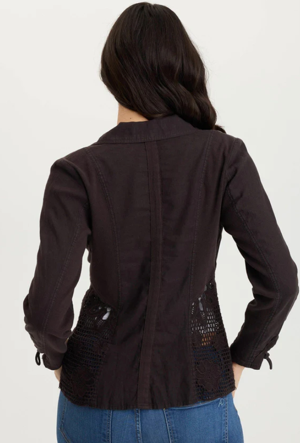 Another classic linen and crochet jacket, this time with a mesh and floral crochet design. Trinket has split sleeve openings with cording and slider details, a one brass button closure and all the flexibility one could ask for with rib inserts and breast pockets.