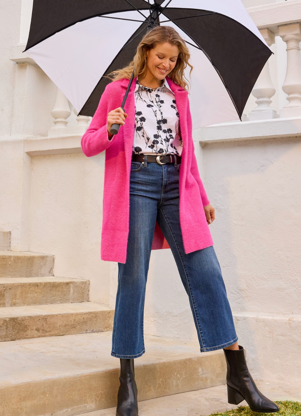 Make a bold style statement with this vibrant raspberry pink coat. It features an open-front design with a relaxed fit for effortless layering. Perfect for adding a pop of color to your wardrobe, this coat combines chic sophistication with cozy comfort, making it an eye-catching choice for day or night.