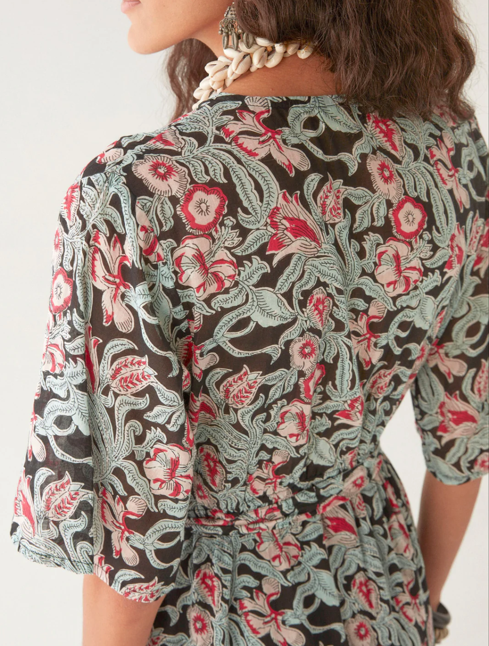 The print is a clash deep florals curling over a moody backdrop, like something lifted from a vintage tapestry left to weather under the sun. There’s movement in every swirl, a rhythm that feels both effortless and deliberate.