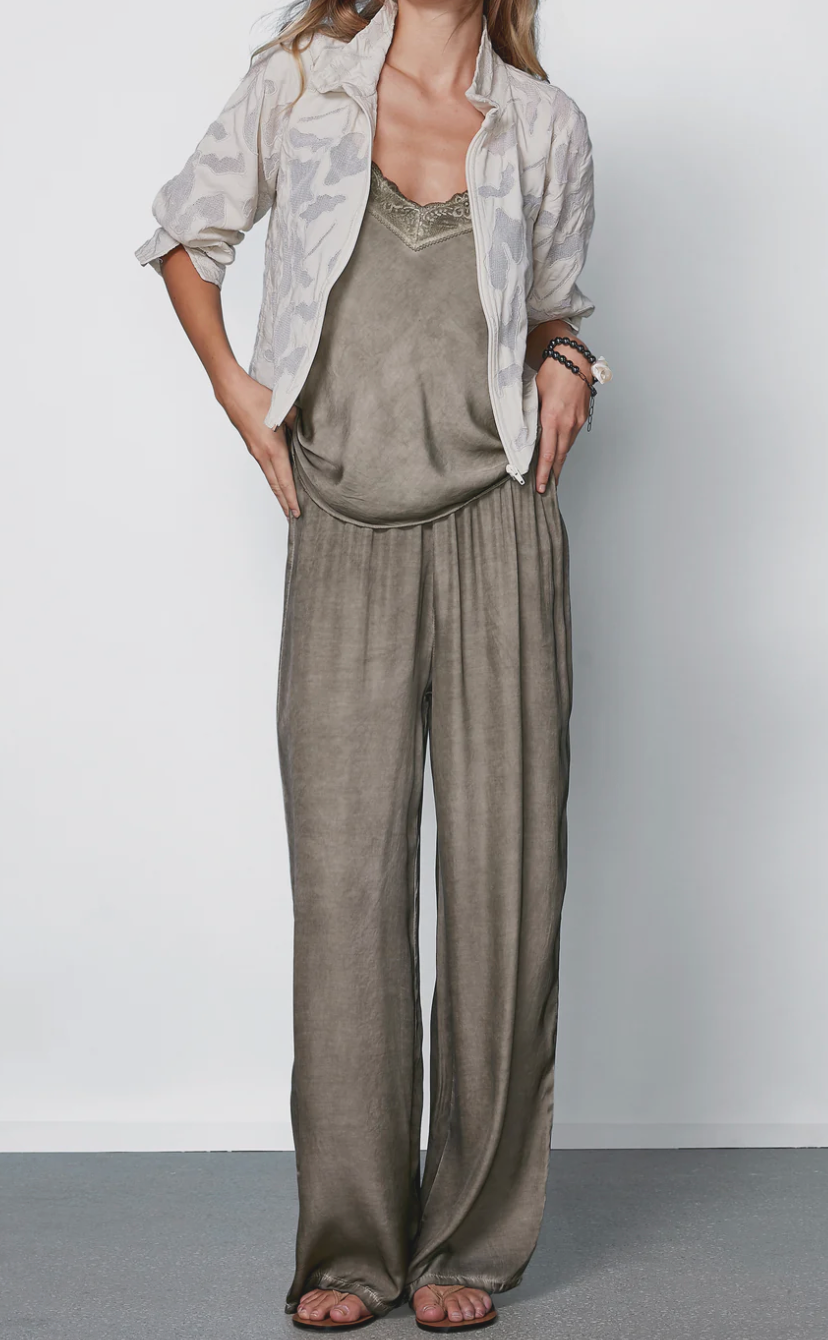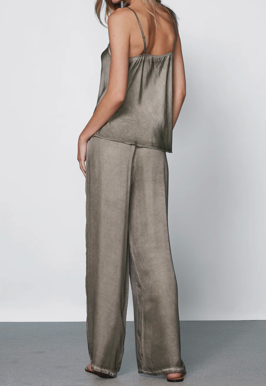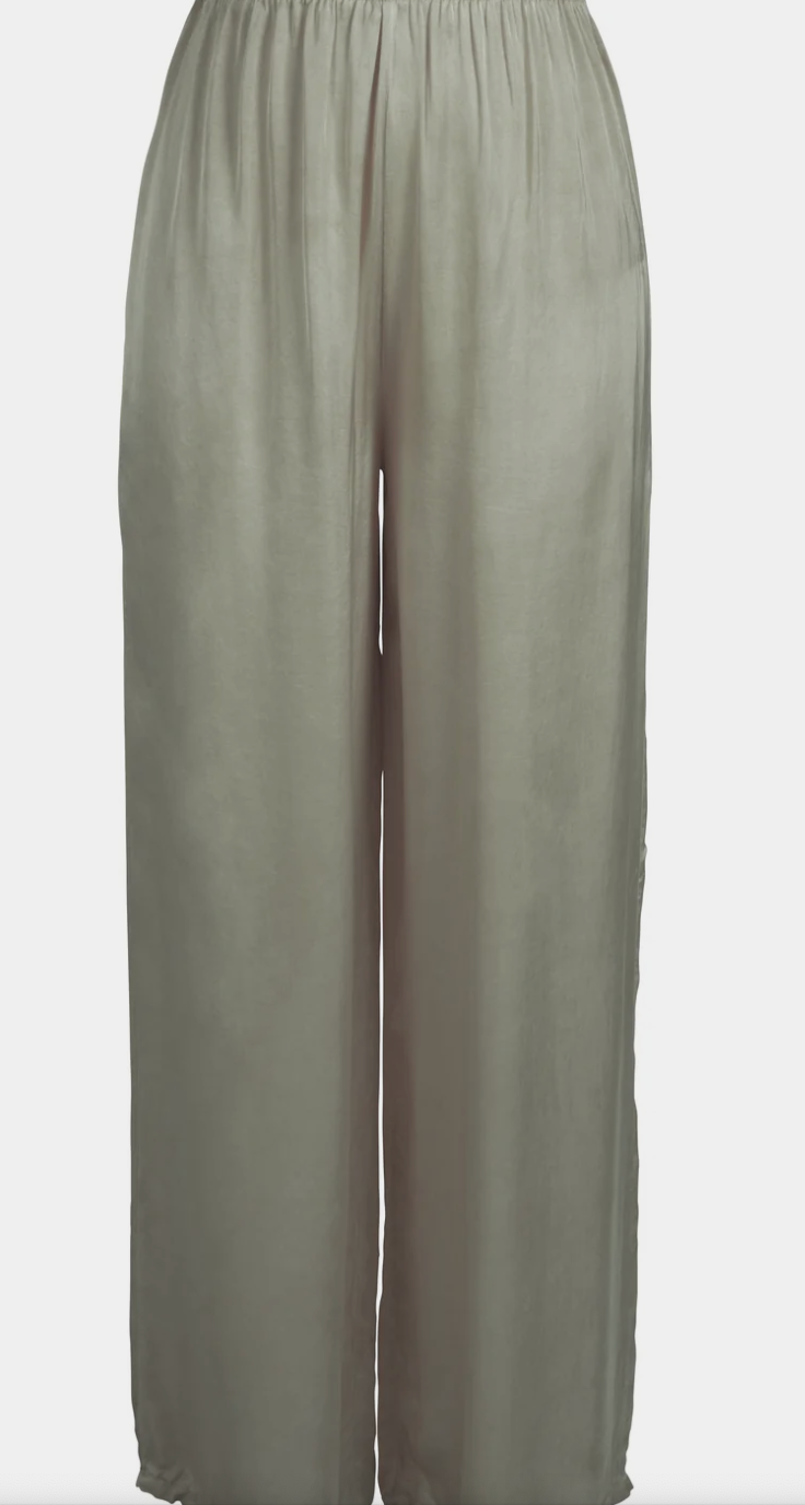 These pants are made in a smooth and lightly shiny material that falls elegantly and gives an exclusive expression. They have wide, straight legs and a comfortable elastic waistband, ensuring a flexible fit. The simple design makes the pants versatile and easy to style for both casual and more festive occasions.