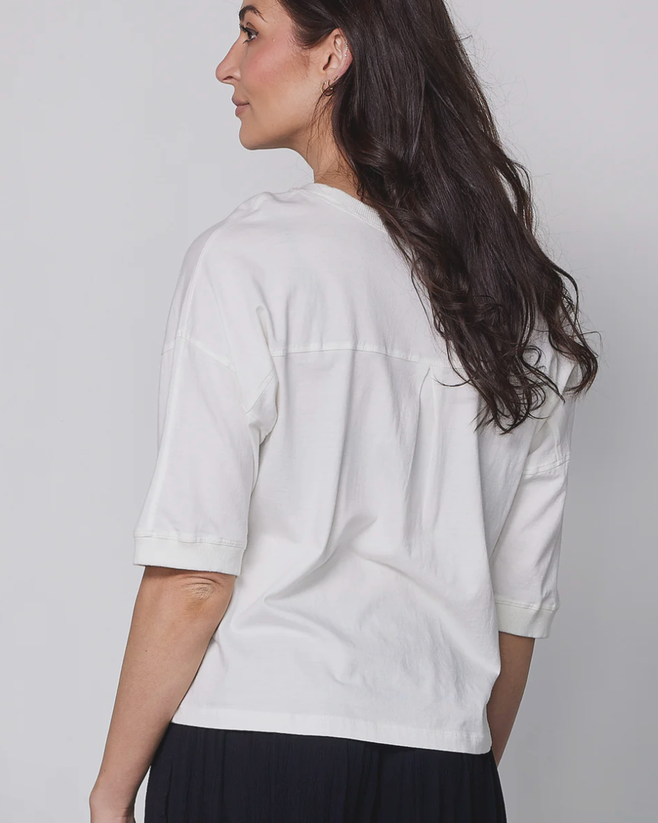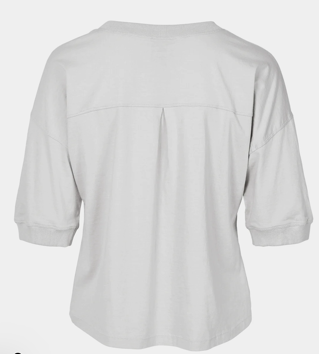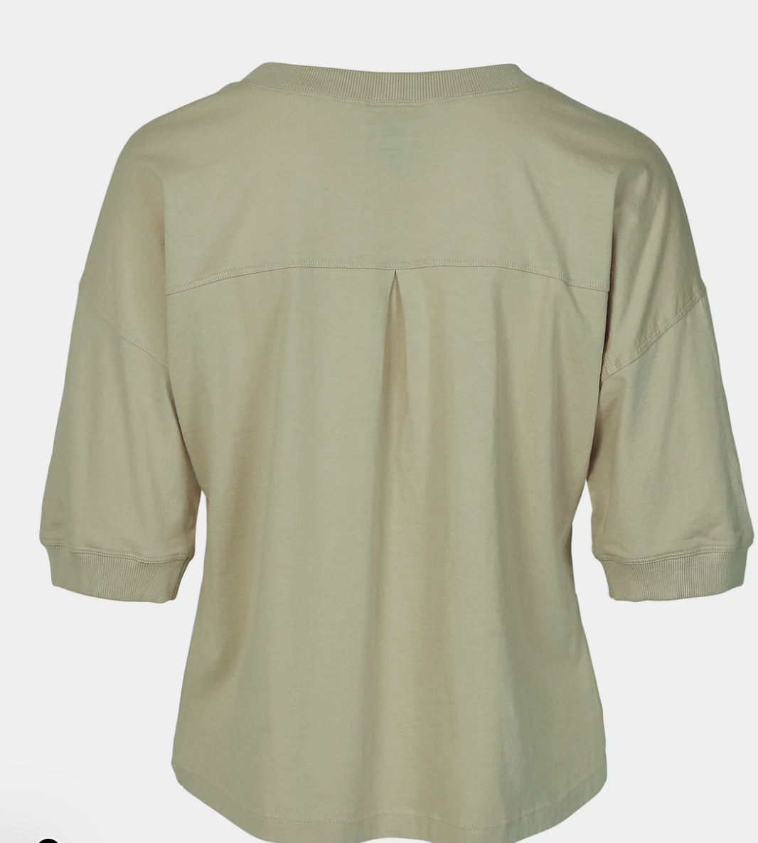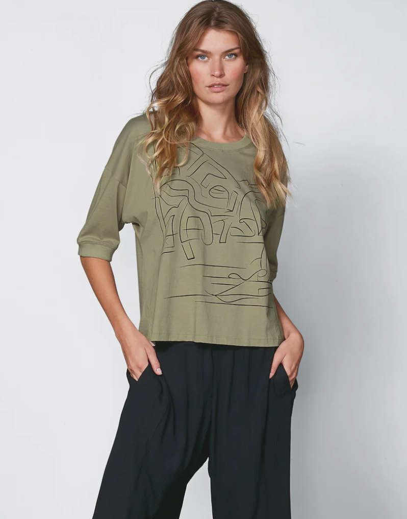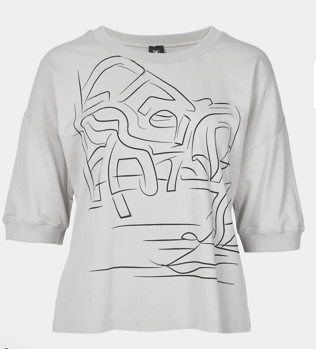 This t-shirt has a relaxed fit with dropped shoulders and elbow-length sleeves, giving it a modern and comfortable look. The front is adorned with a graphic print that adds character, while a small pleat at the back provides extra movement. Ribbed edges at the neckline and sleeves complete the casual look.