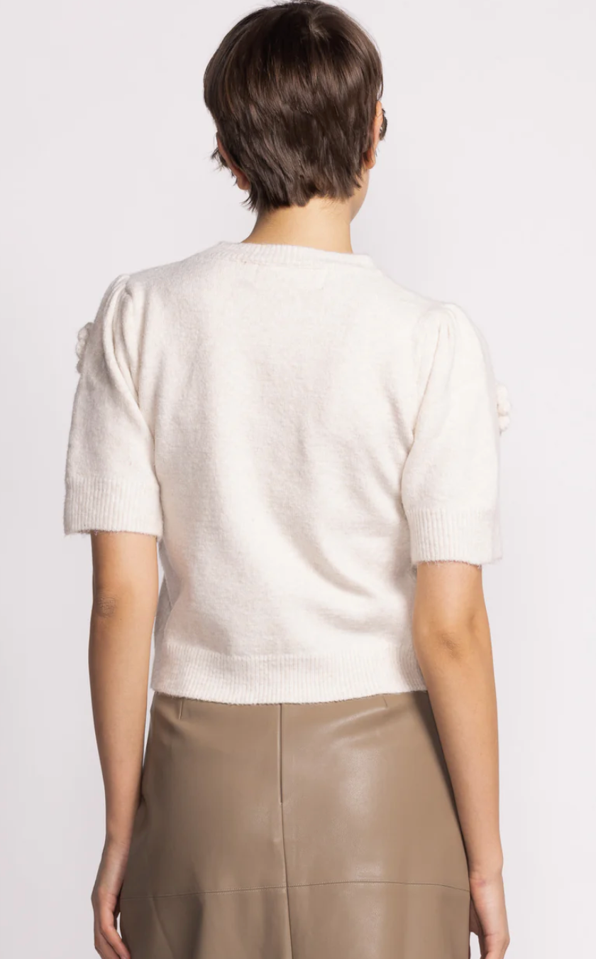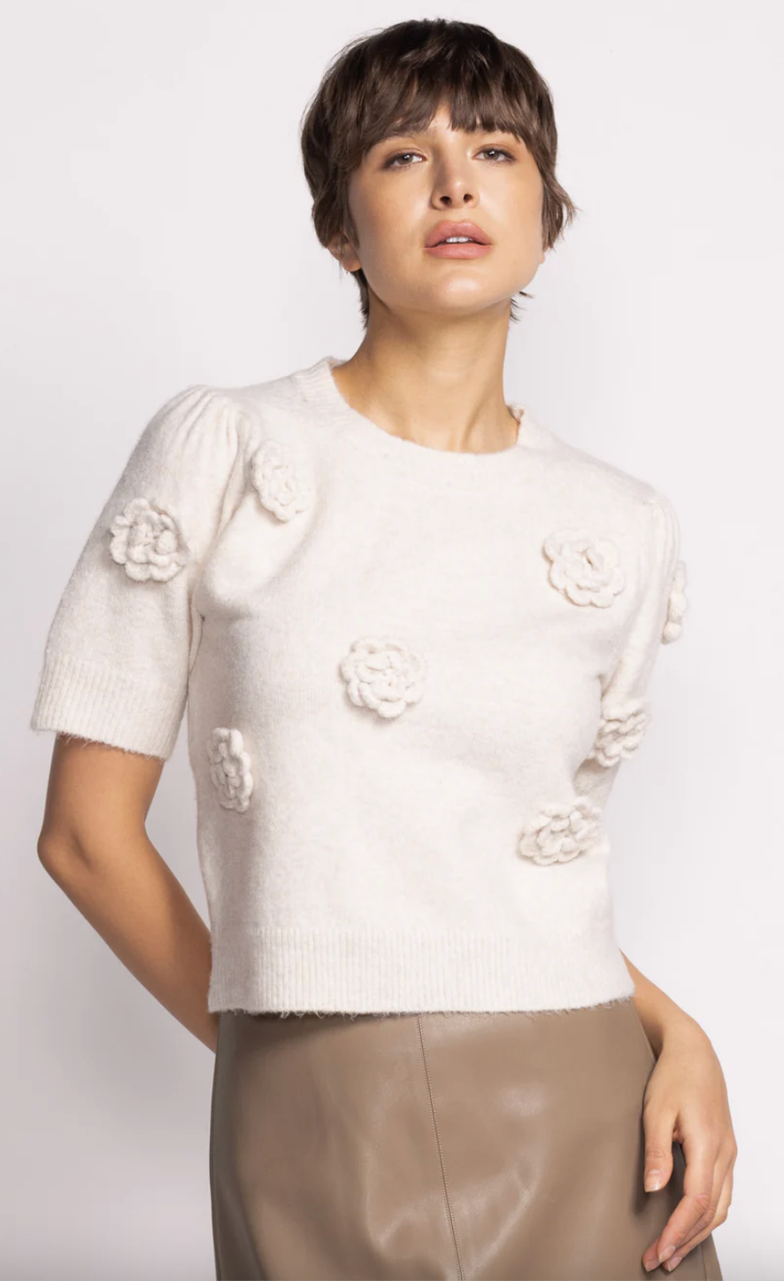The Roslyn Sweater is a cozy, timeless piece with rosette details that make it a standout statement. It combines classic comfort with unique, eye-catching design.