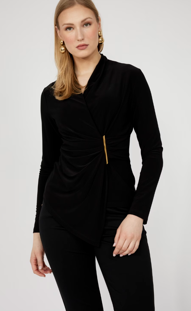 Introducing the Frank Lyman pullover that perfectly blends chic, elegant, and sophisticated style. This hip-length, fitted design features a flattering v-neckline and long, straight sleeves. Ideal for casual, semi-formal, or night-out occasions, its ruched, wrap, and belted attributes add a touch of refinement. Embrace a timeless, plain pattern that complements any wardrobe, ensuring you always look effortlessly polished.