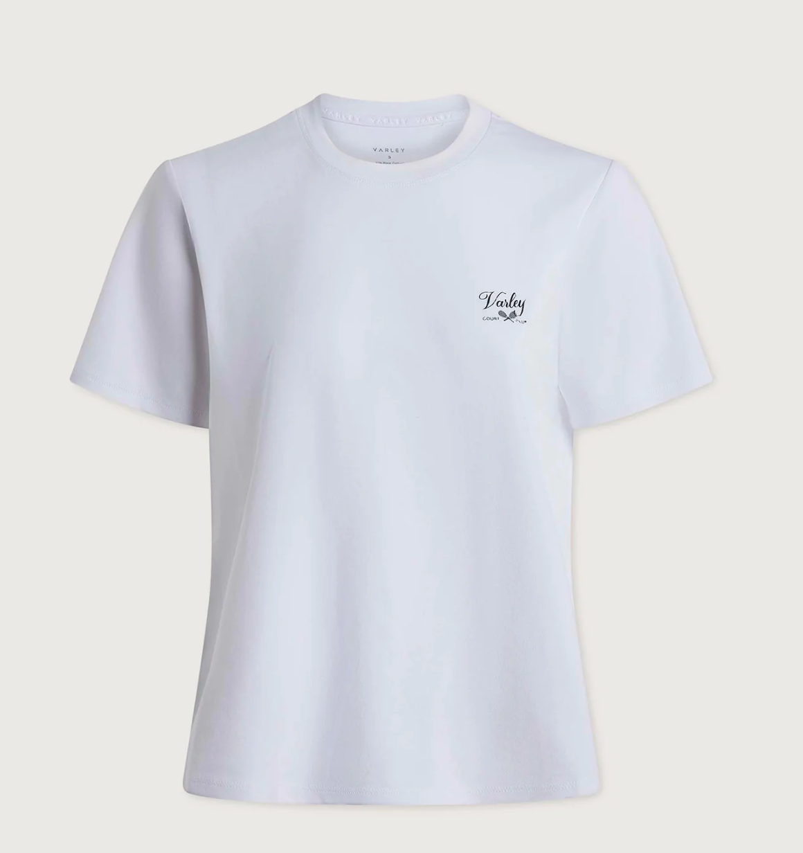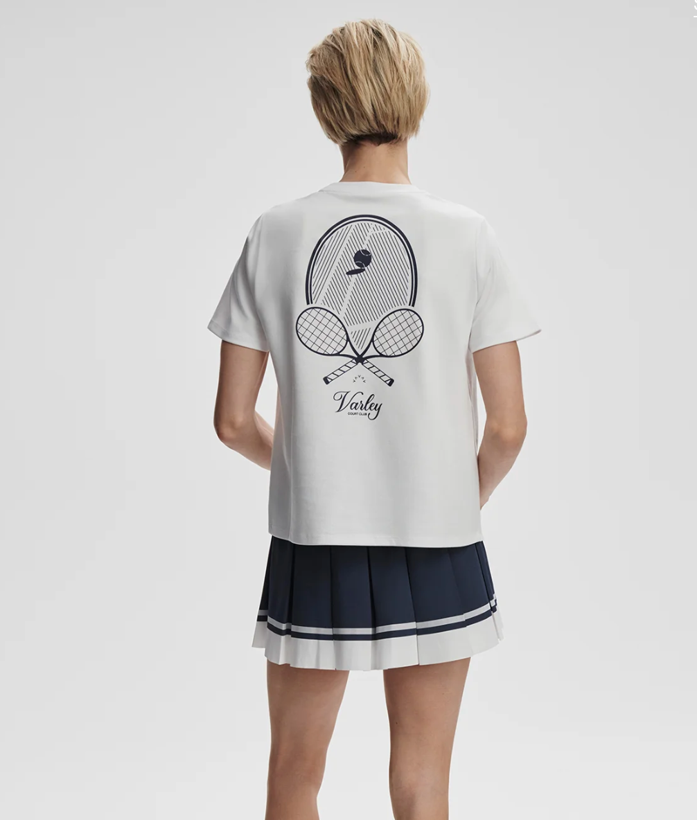 The Mattie is an updated move on from the Coventry, drawing the same inspiration from a classic varisity tee and made from pima cotton pique. It features a smaller Varley emblem with racquet design on the chest and a bigger one on the back, both of which are printed on.