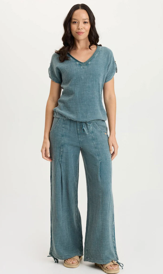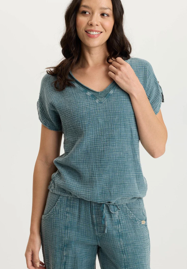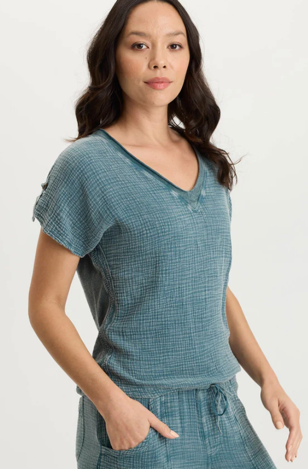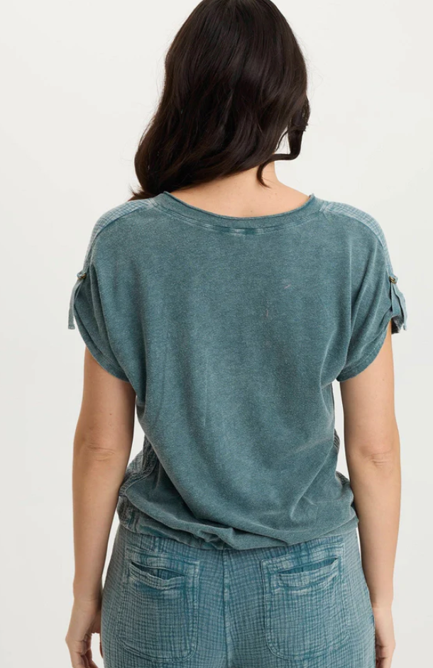 In a traditional XCVI silhouette, Bower V-Neck Tee has tabbed short sleeves, mesh trim inserts, a cinchable bubble hem and a contrasting slub jersey back panel.