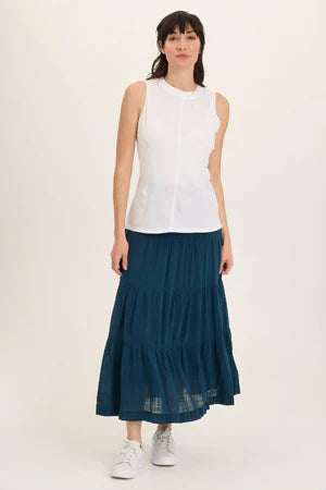 A shirred high waist and tiered, flowing silhouette make this Cocoon Gauze midi skirt as comfy as she is twirl-worthy.