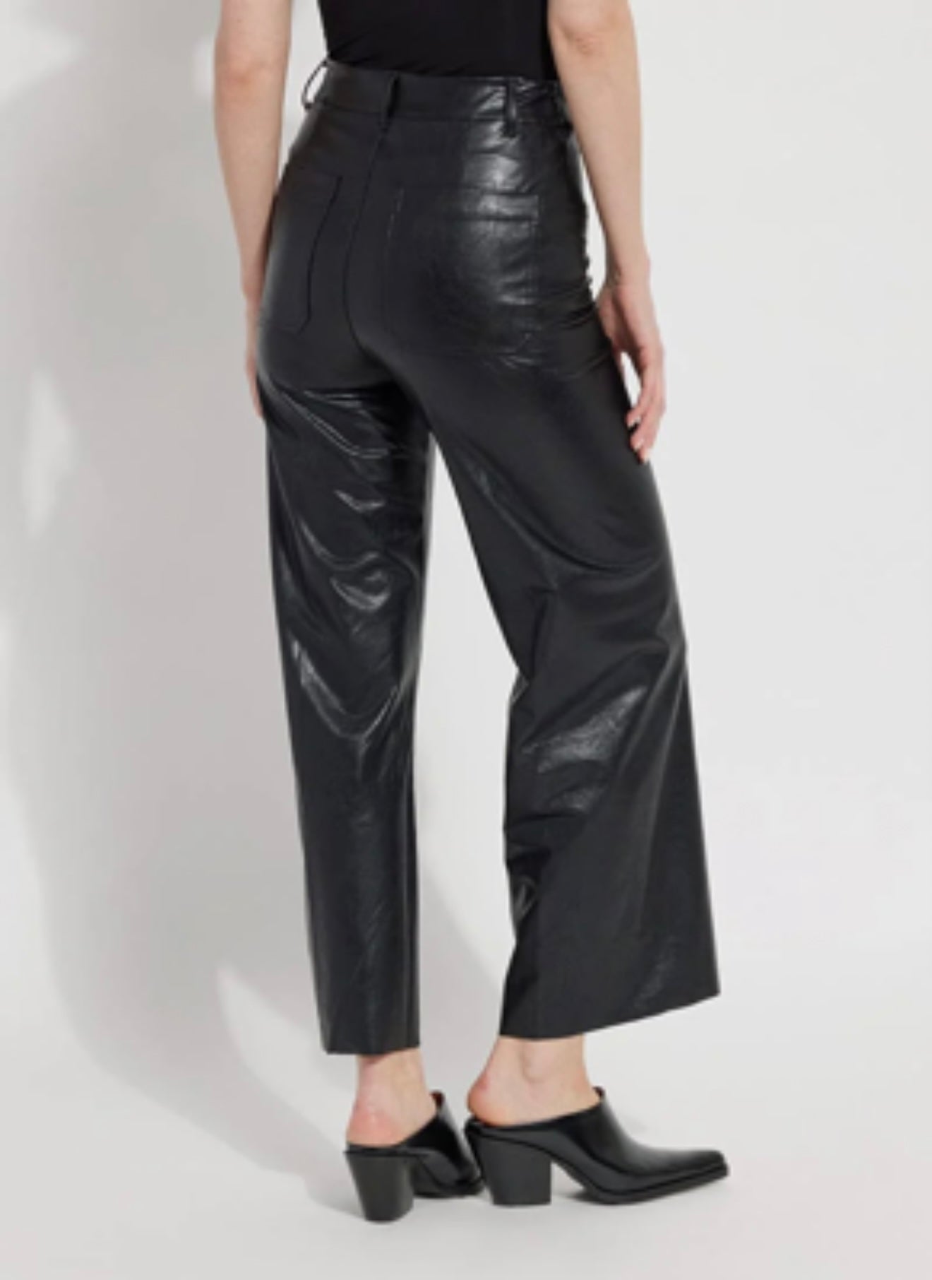 The Hi Waist Vegan Leather Wide Leg pant is fitted at the waist and hip before falling into a wide, ankle-length leg. Made from 4-way stretch Textured Vegan Leather, these wide-legged pants feature a concealed patented waistband, beltloops, patch pockets and no side seam for a slimming look. A raw-edge hem makes them simple to shorten.