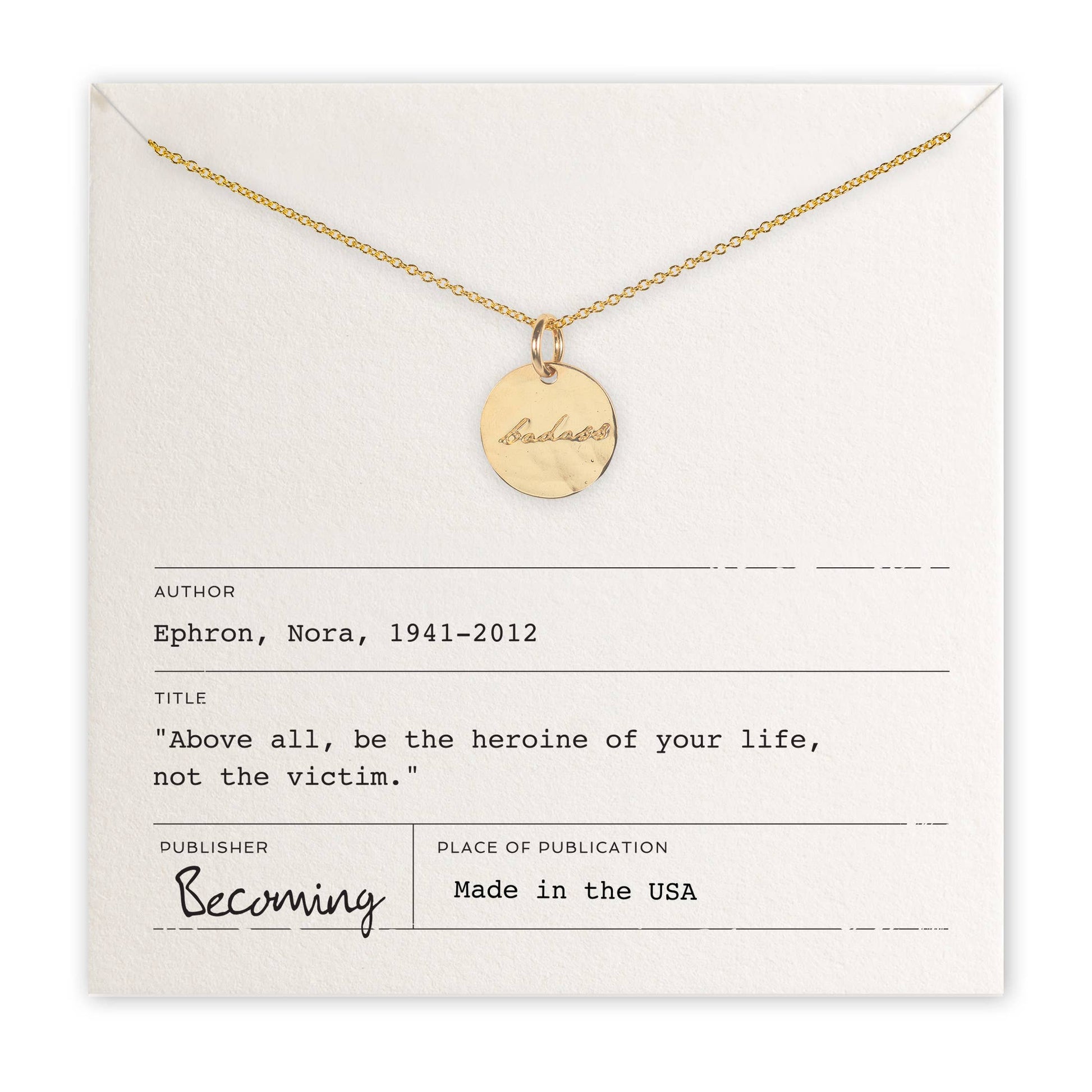 "Above all, be the heroine of your life, not the victim." -Nora Ephron On charm: Antique handwriting font "badass" Charm size: 1/2" Length: 18" fine cable chain Available metals: Sterling silver , gold filled Packaging: Message necklace card + jewelry box