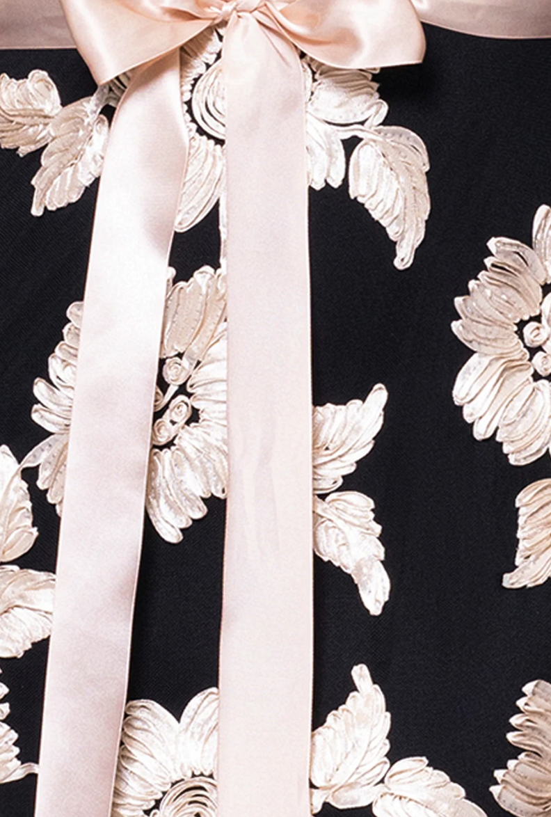 This stunning dress features elegant floral embroidery against a sheer base, creating a sophisticated, yet modern silhouette. The long-sleeve design is balanced by a delicate satin bow at the waist, adding a touch of femininity. Perfect for any formal occasion, this dress exudes grace and timeless style.