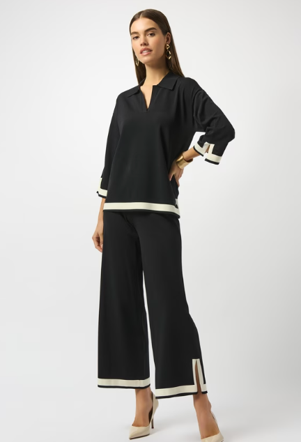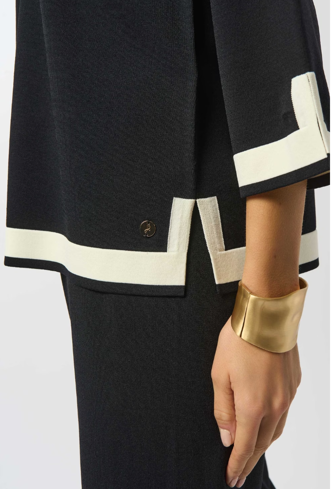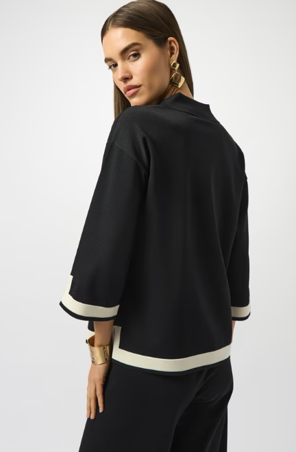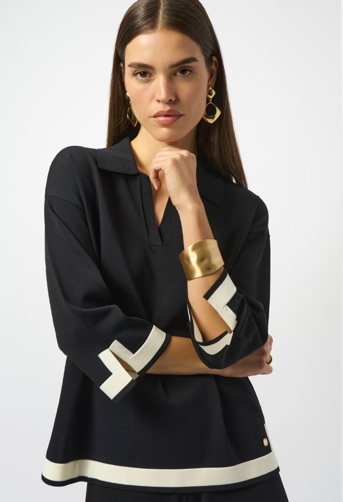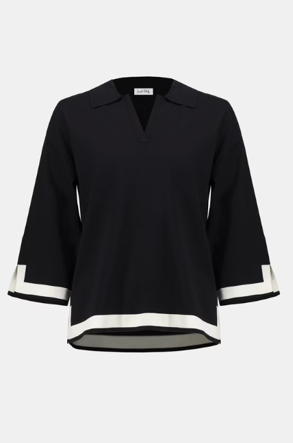 Introducing the Joseph Ribkoff pullover, a chic and minimalistic addition to your wardrobe. This hip-length, regular-fit piece features a buttoned and embellished closure, paired with a sophisticated collar and V-neckline. Perfect for casual, office, or semi-formal occasions, it boasts a plain pattern and 3/4 straight sleeves, ensuring both style and comfort.