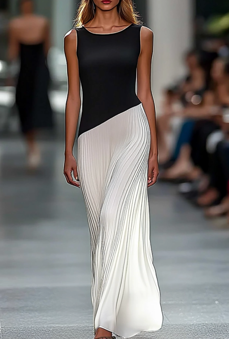 This black and white color-block dress is perfect for bringing a touch of elegance to your daily business attire. The sleeveless design keeps it cool and comfortable for long office hours, while the pleated maxi skirt adds a graceful and professional finish. With its modern yet refined look, this dress is ideal for meetings, conferences, or even after-work events.