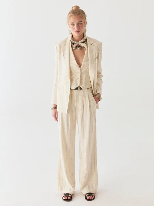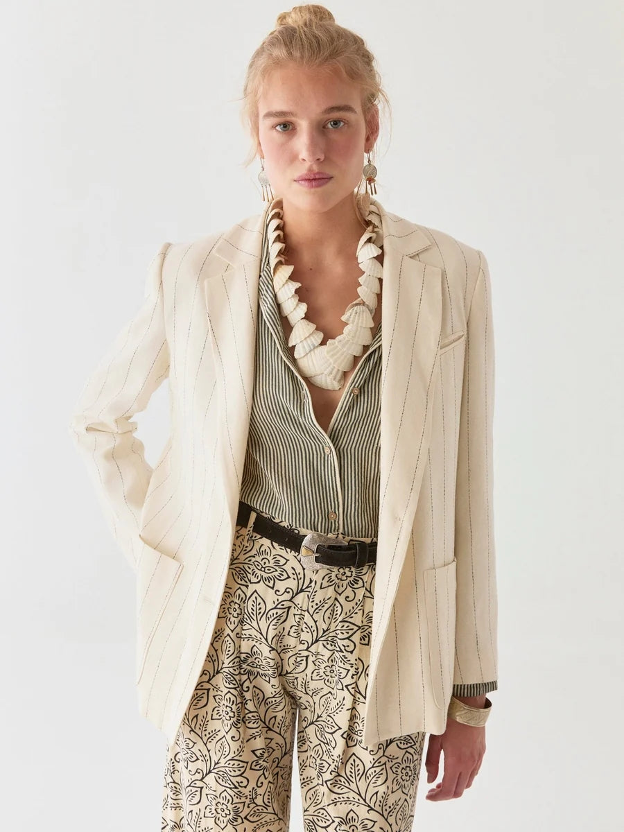 Cut from a 70% viscose, 30% linen blend, it’s got that perfect balance of soft drape with just the right amount of edge. The fine vertical stripes keep it sharp, while the relaxed fit, tortoise-shell buttons, and front pockets add a touch of laid-back cool.