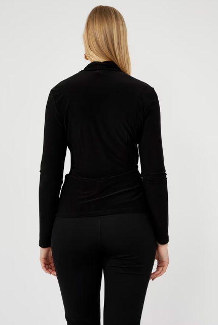 Introducing the Frank Lyman pullover that perfectly blends chic, elegant, and sophisticated style. This hip-length, fitted design features a flattering v-neckline and long, straight sleeves. Ideal for casual, semi-formal, or night-out occasions, its ruched, wrap, and belted attributes add a touch of refinement. Embrace a timeless, plain pattern that complements any wardrobe, ensuring you always look effortlessly polished.