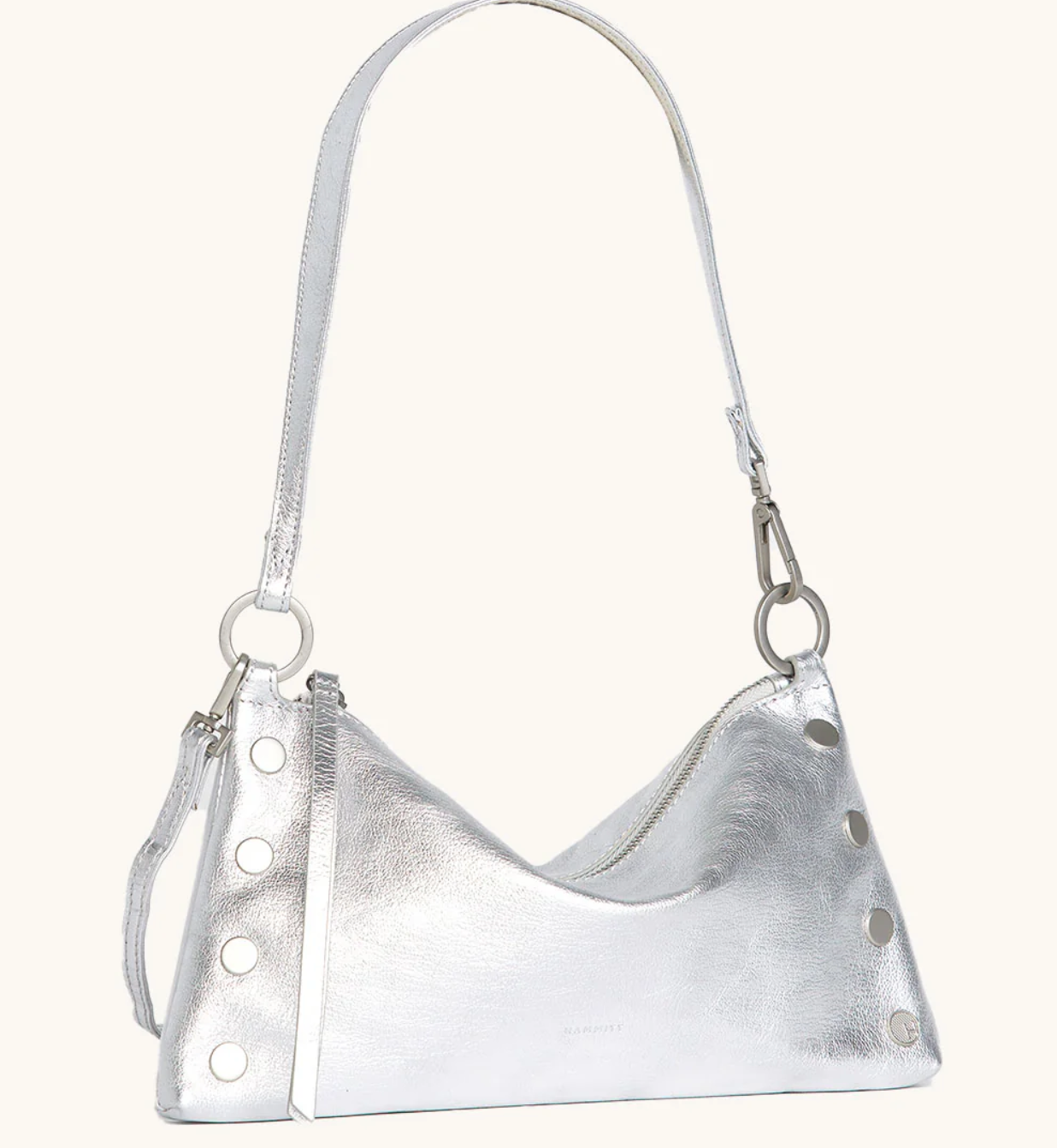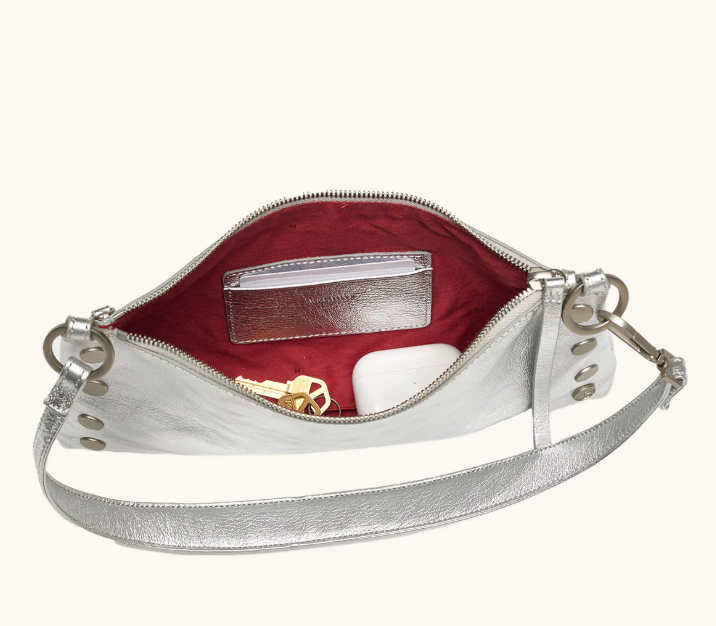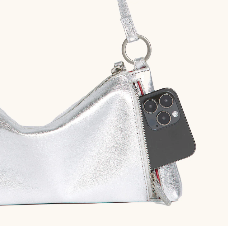 This fresh, of-the-moment bag is entering the chat as a must-have companion for nights on the town. Featuring a slouchy but current shape, this versatile little number transitions from a wristlet to a shoulder bag in seconds flat. The Kyle also includes a removable and adjustable crossbody strap, so you can go hands-free - and carry a couple of cocktails. Inspired by the glistening sidewalks of Hermosa Beach and heat-fueled mirages on nearby sand, Sidewalk Silver celebrates our favorite sparkling ocean views. Crafted with a luxurious Italian side calf, the pebble grain effect is natural and iron pressed with a glossy top, creating a deeply dimensional effect that's truly a sight to behold. Pairs well with tan lines on warm summer evenings.