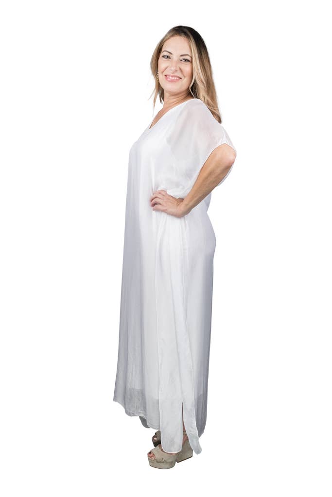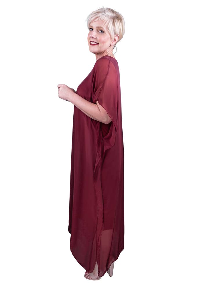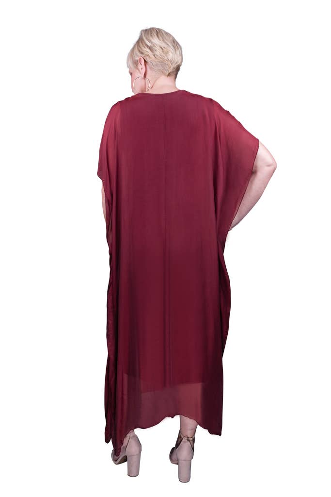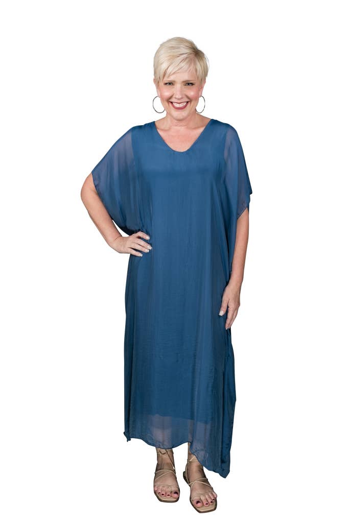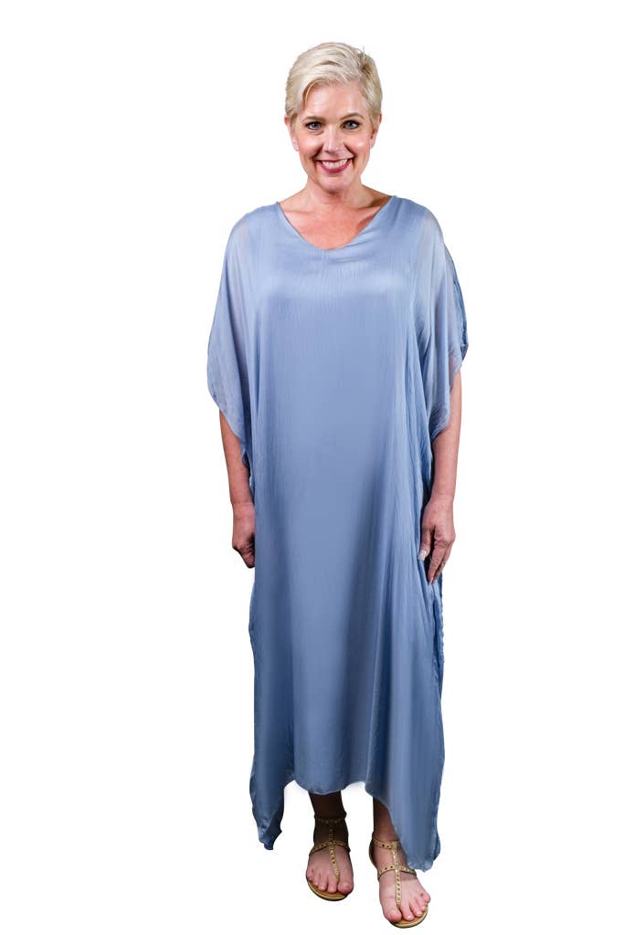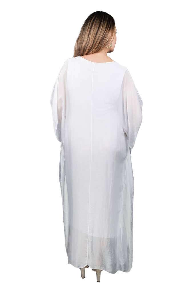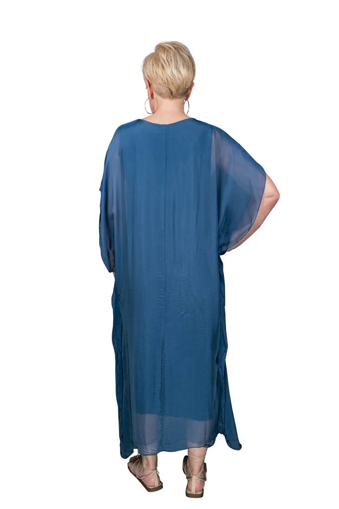 This elegant Kaftan dress can attend a wedding with some statement jewelry or be tossed over a swimsuit and you are ready to head out to dinner! The silk overlay has a pretty transparency, but no worries about wardrobe malfunctions due to our buttery soft Viscose lining underneath. Elbow length sleeve appropriate for any occasion. Made in Italy. • Flattering V-neckline • Flowy, easy fit • Full length • One size fits most (REALLY!) 2 – 12/14 • Machine wash cold, delicate, with like colors. Lingerie bag recommended. Hang or lay flat to dry.