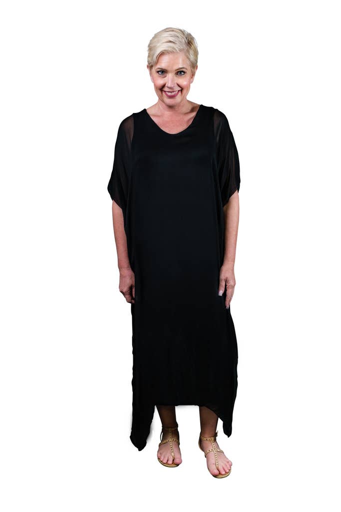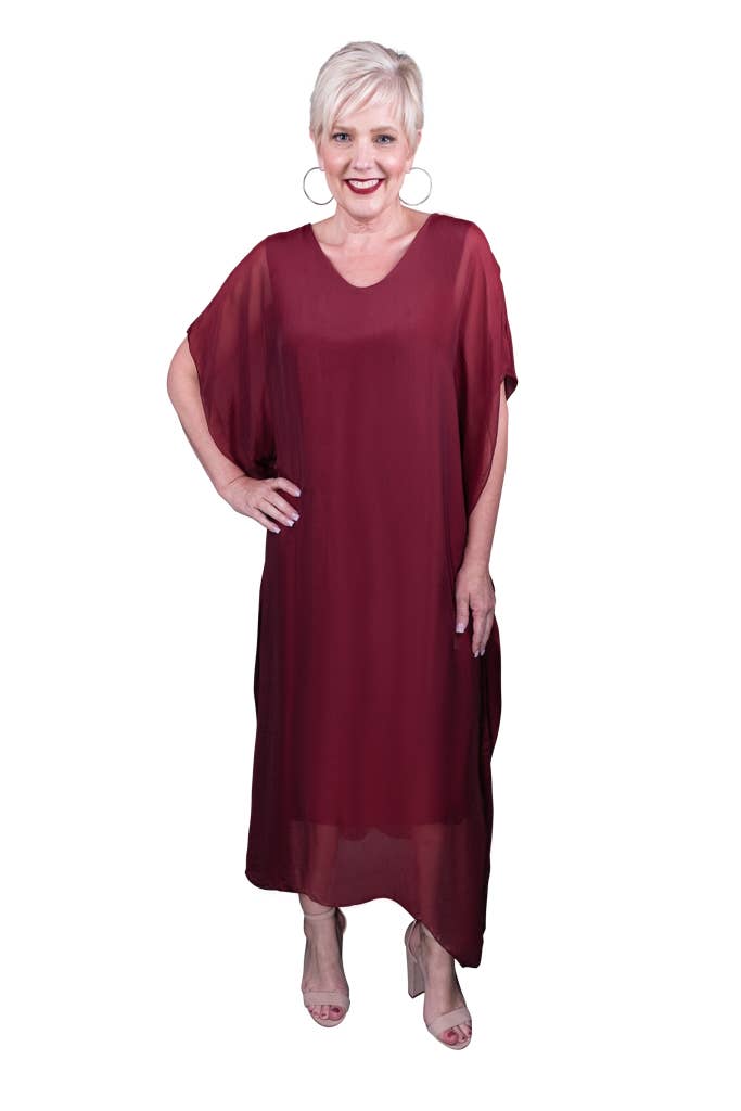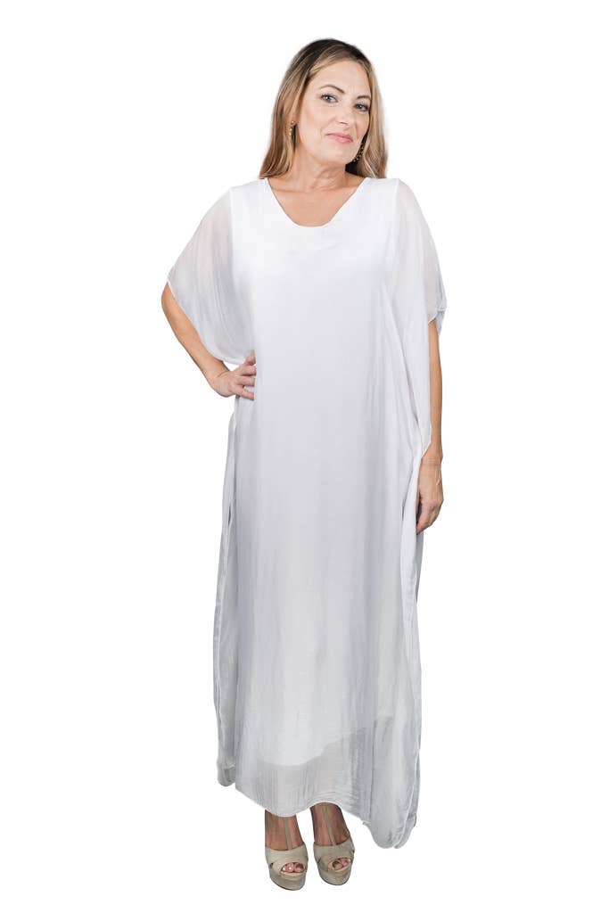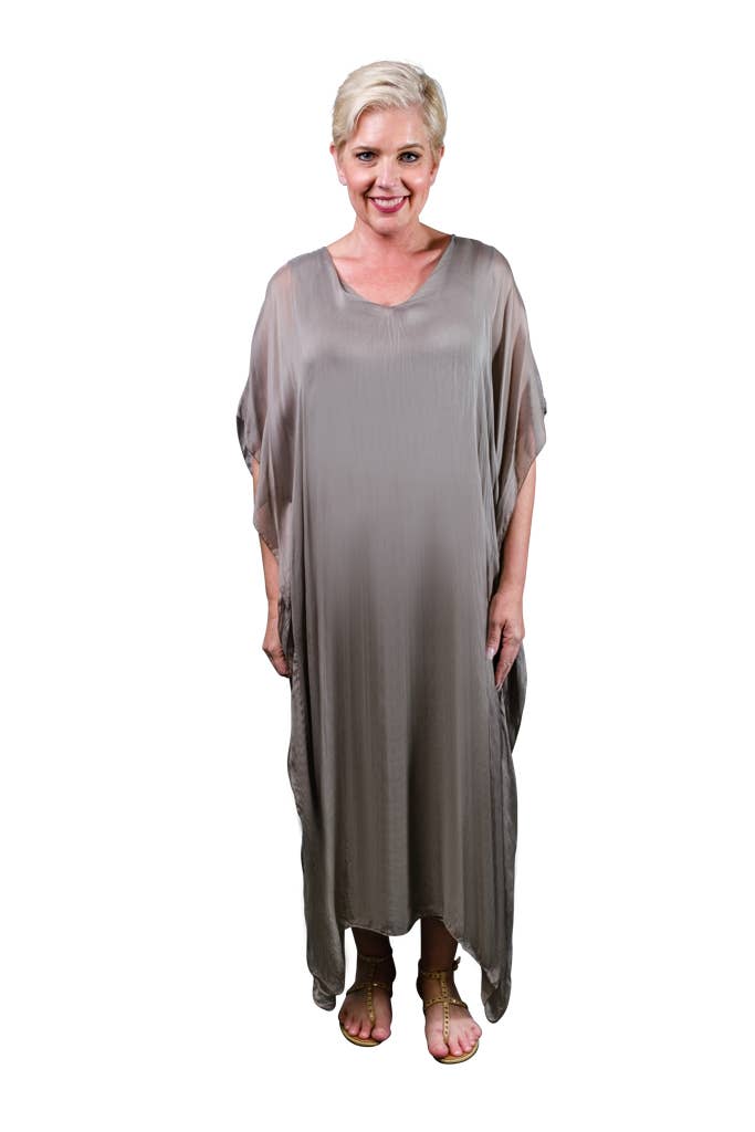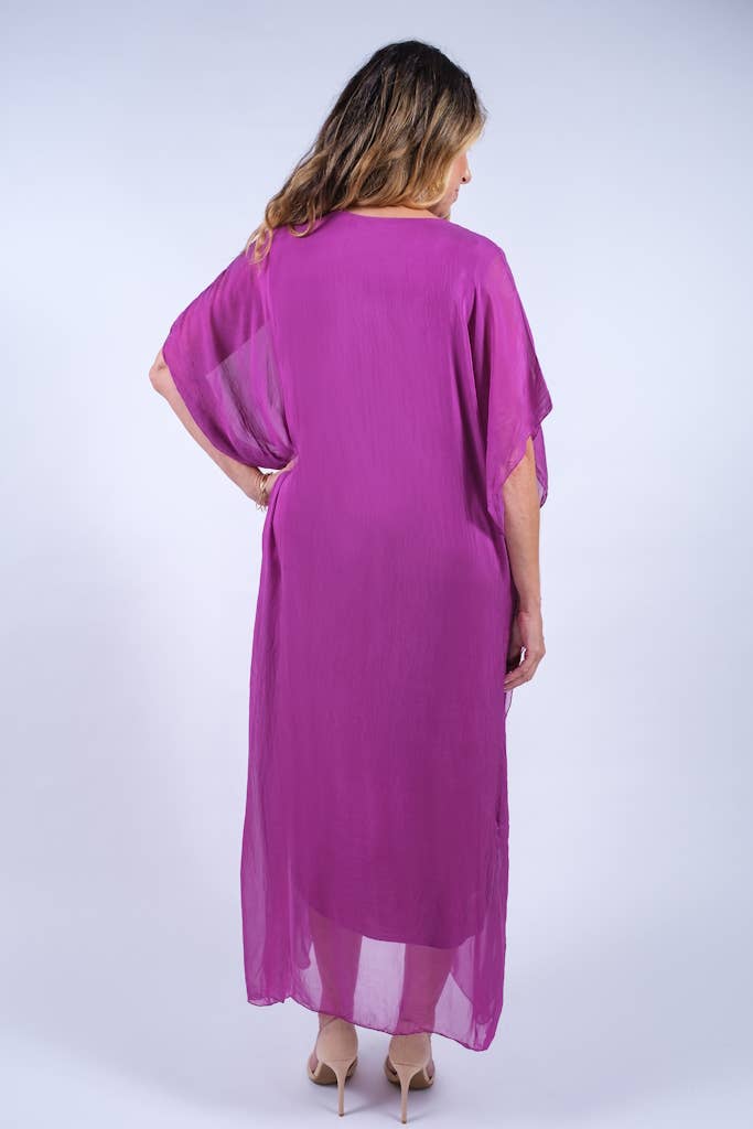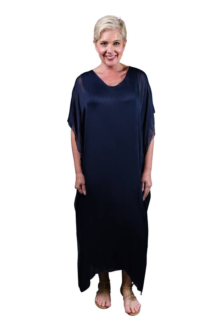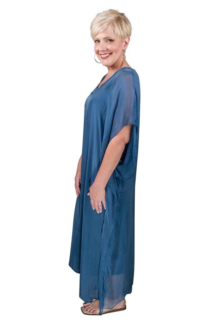This elegant Kaftan dress can attend a wedding with some statement jewelry or be tossed over a swimsuit and you are ready to head out to dinner! The silk overlay has a pretty transparency, but no worries about wardrobe malfunctions due to our buttery soft Viscose lining underneath. Elbow length sleeve appropriate for any occasion. Made in Italy. • Flattering V-neckline • Flowy, easy fit • Full length • One size fits most (REALLY!) 2 – 12/14 • Machine wash cold, delicate, with like colors. Lingerie bag recommended. Hang or lay flat to dry.