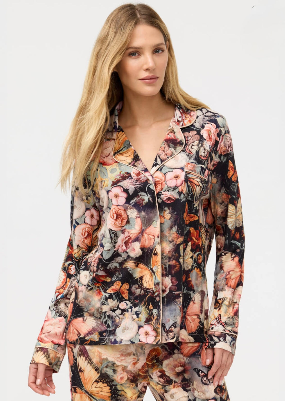 Beautifully embellished with a vibrant floral motif, the Jaclyn Long Set offers a fresh take on a classic pajama silhouette. Crafted from 100% sumptuous silk, these pajamas feature a button-down long sleeve camp shirt paired with coordinating pants with pockets. Wear layered with the Karie Cozy Robe for a relaxing evening in with a good book