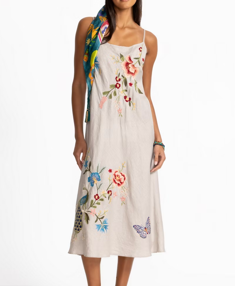 Beautifully embellished with intricate embroidered floral details, with the Linen Modern Sleep Dress is crafted from breezy 100% linen. Designed with a scooped neckline and adjustable spaghetti straps, this slip dress offers a bias cut slip silhouette. Pair with delicate jewelry and a fringe scarf for an evening out.