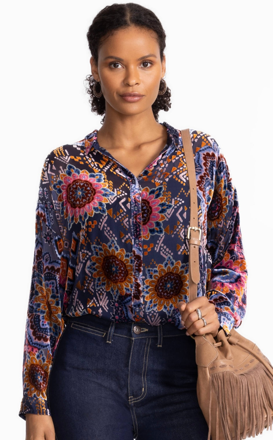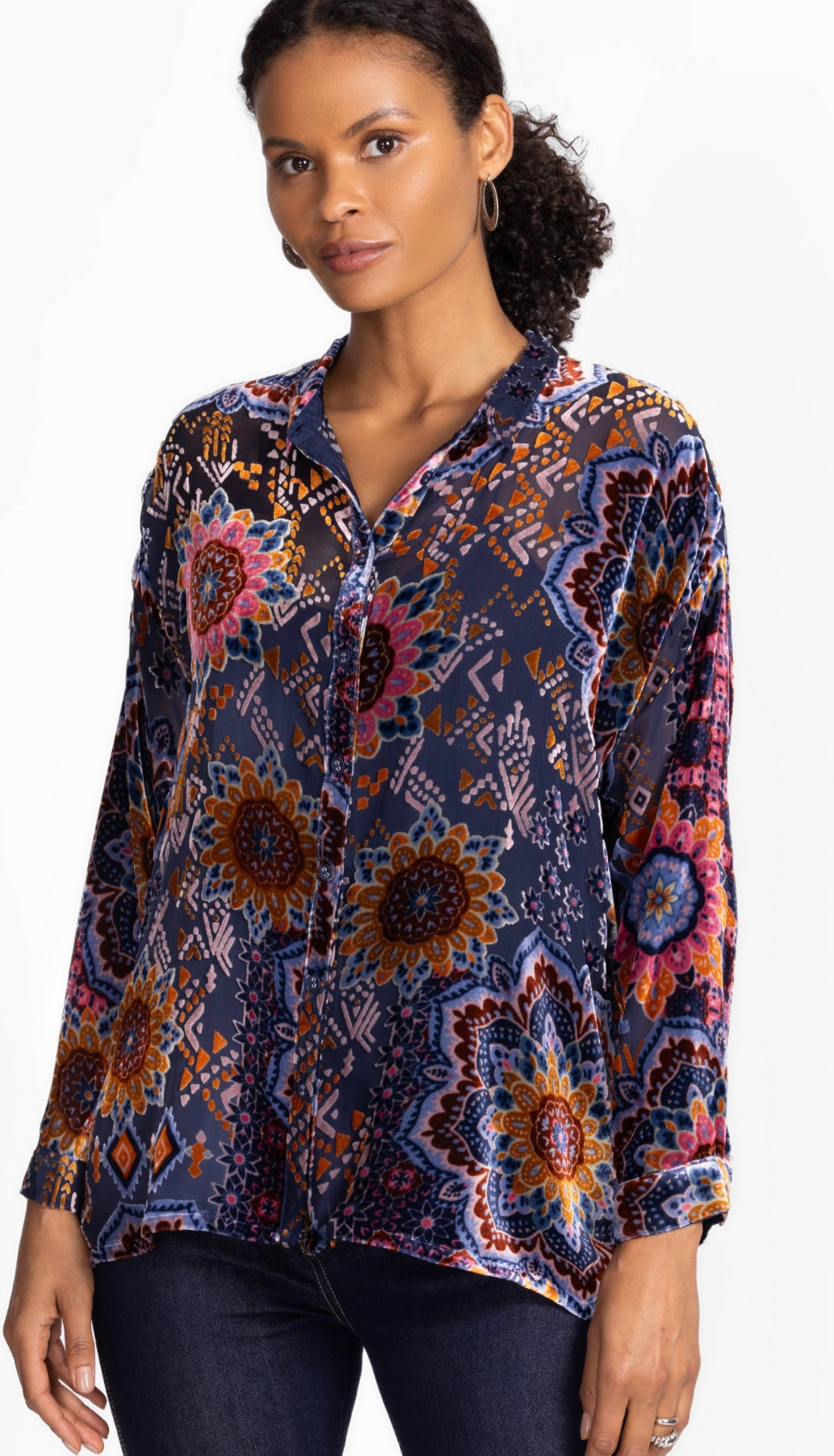 Beautifully embellished with a retro-inspired pattern and burnout detailing, the Oversized Audrey Shirt offers a boyfriend oversized silhouette and a relaxed fit. Crafted from a luxurious silk blend, this button-front shirt is finished with a drop shoulder. Pair with color denim and colored flats for a vibrant casual ensemble.