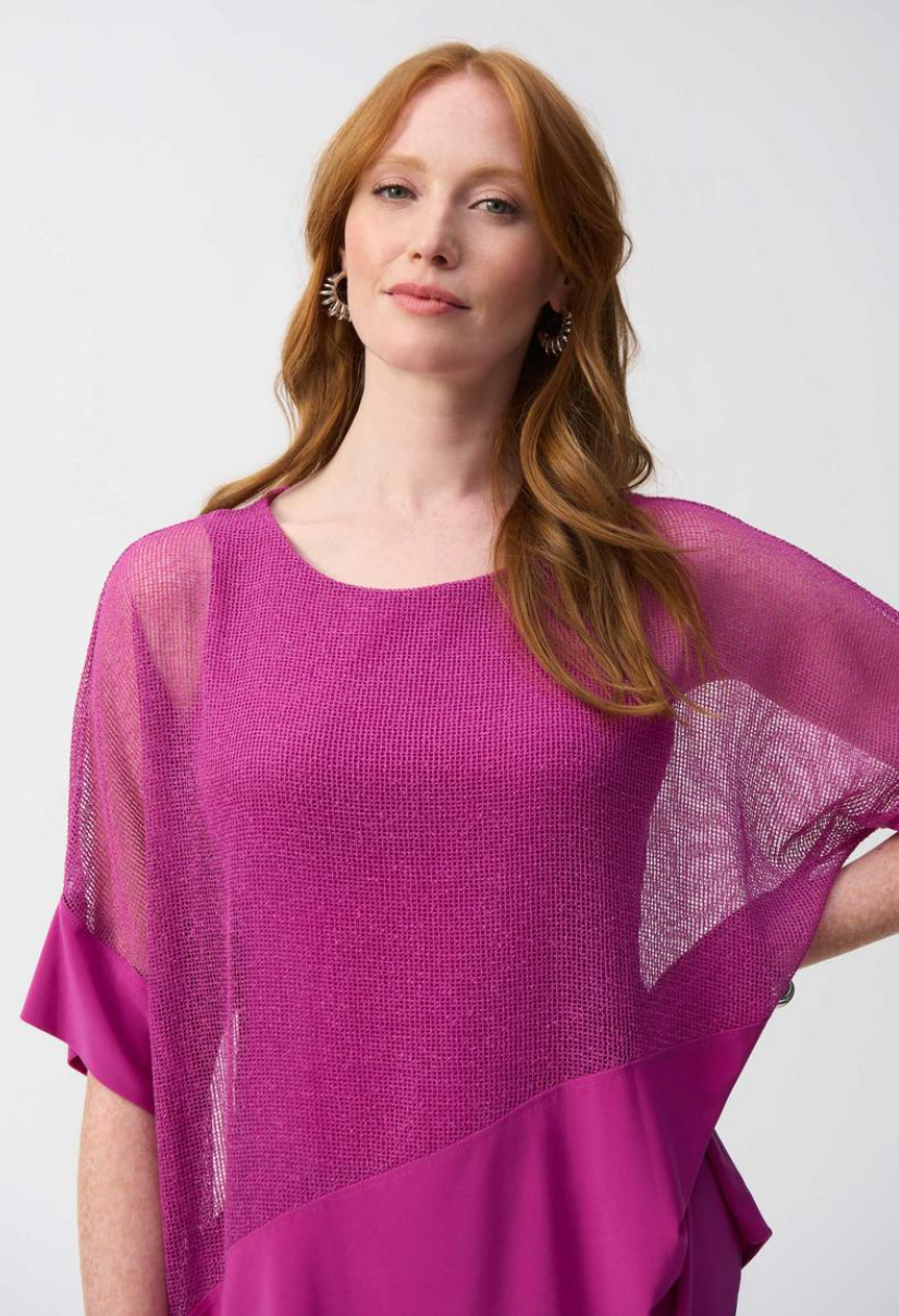 Embrace the glamour of this exquisite mesh top. The piece features a silky knit camisole attached to the garment that adds instant style and versatility to any look. The short dolman sleeves bring an airy feel to the design while the bold asymmetrical hemline complements the top’s cocoon silhouette.