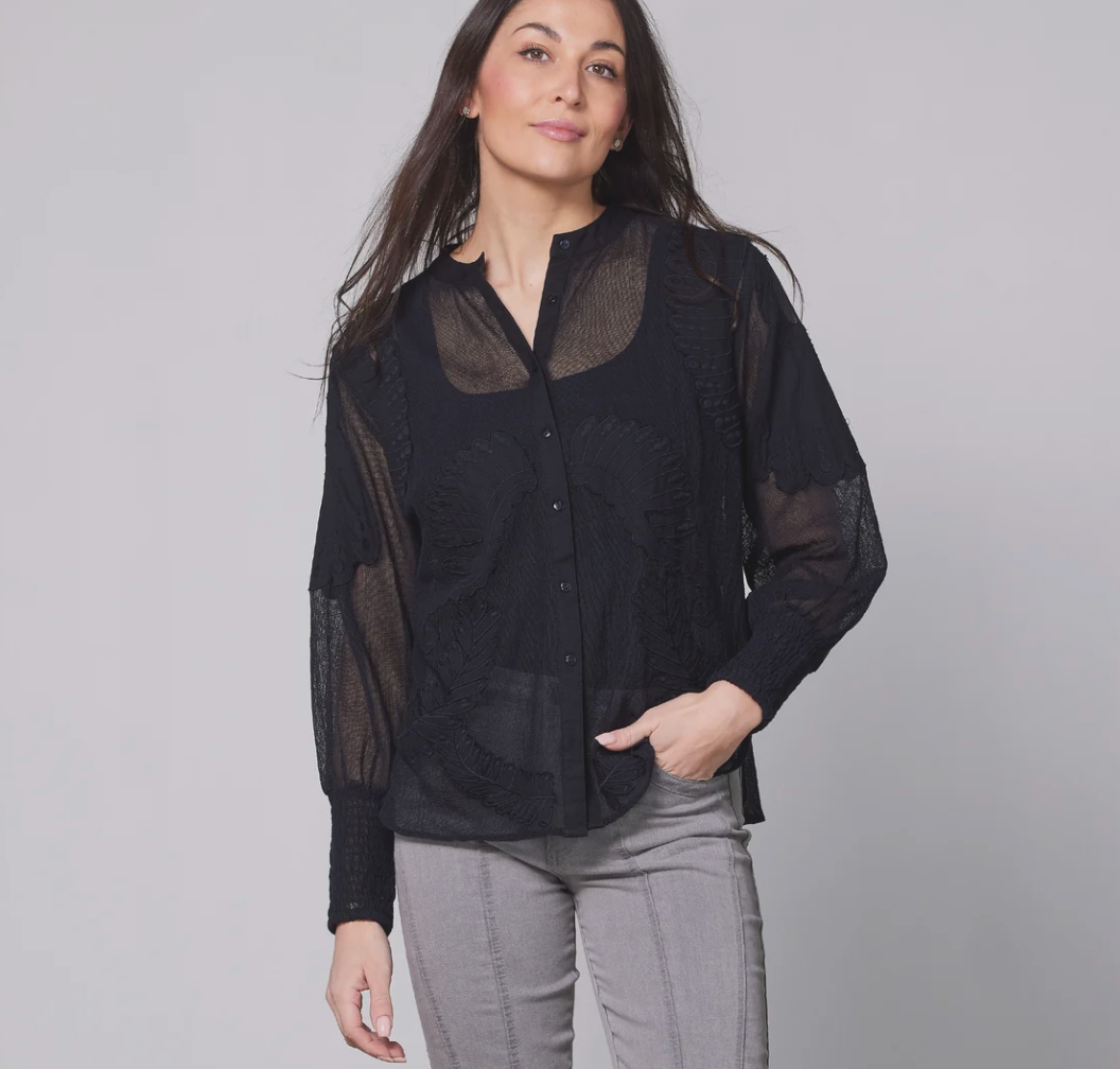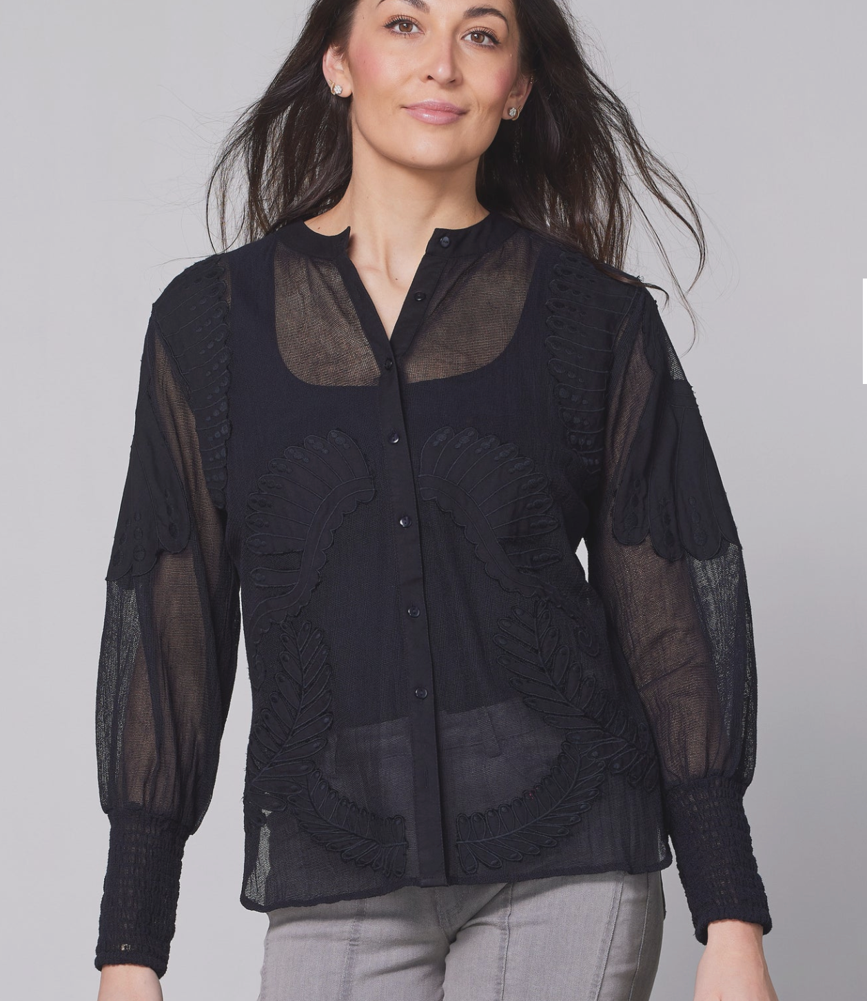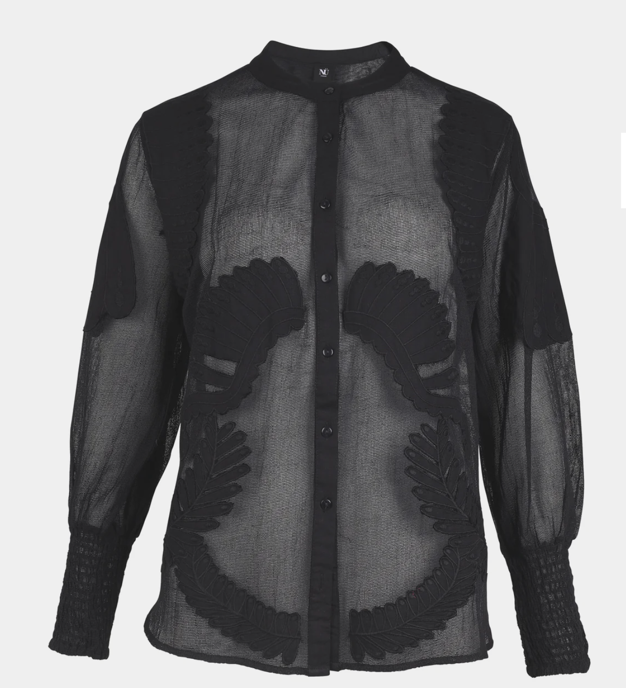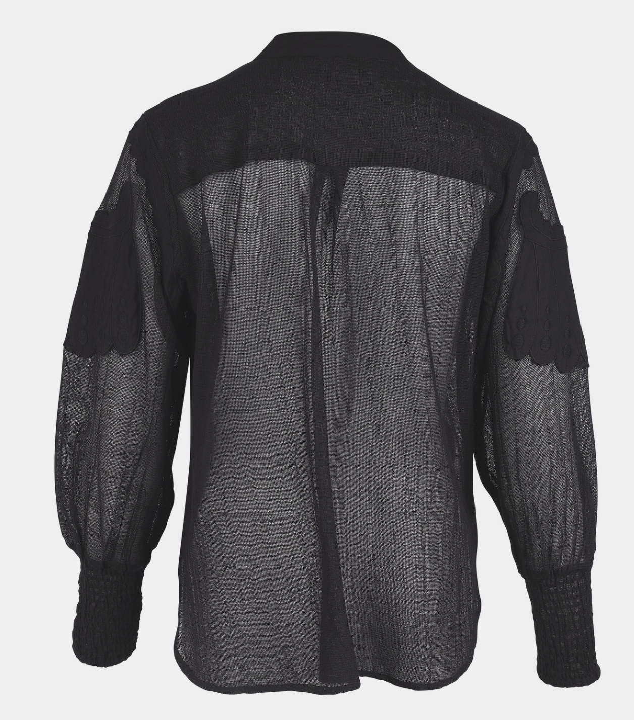 This shirt features an elegant and light transparent mesh design with decorative embroidered details that add an exclusive expression. It has a classic button closure, a small stand-up collar, and long sleeves with smocked cuffs that provide a feminine touch. The loose fit creates an airy and sophisticated look.