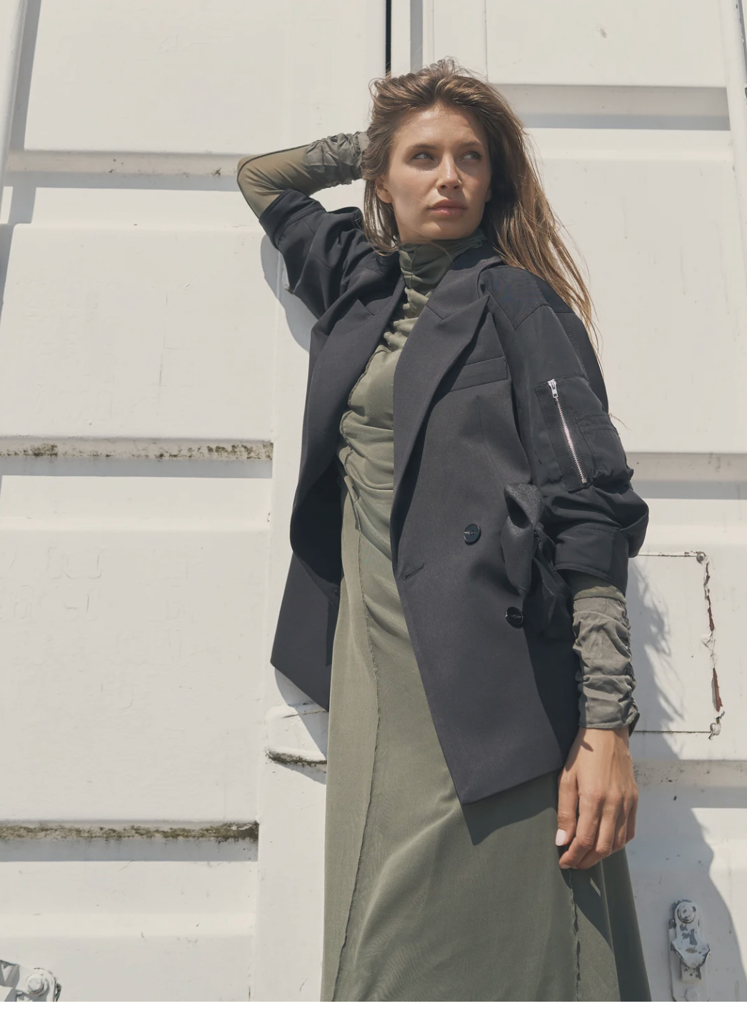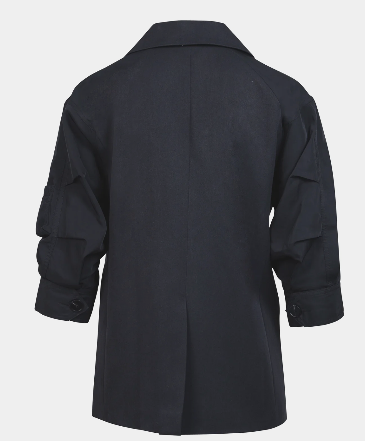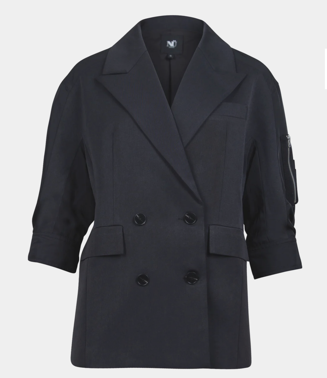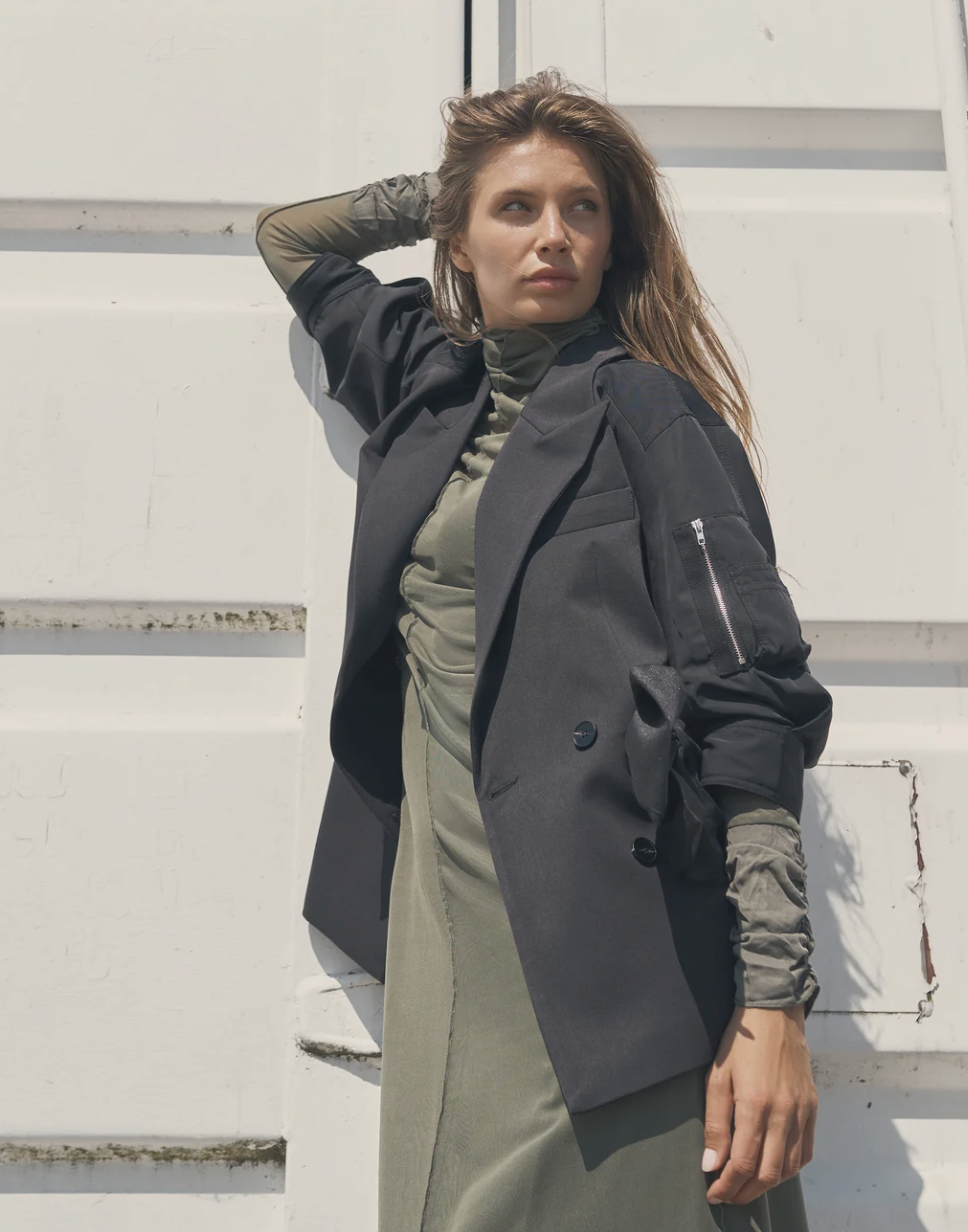 This jacket features a classic double-breasted design combined with modern details. The wide lapels and sharp lines create a sophisticated expression, while the rolled-up sleeves with zipper details add a raw twist. The pockets add both functionality and style, and the light A-shape provides a flattering fit.