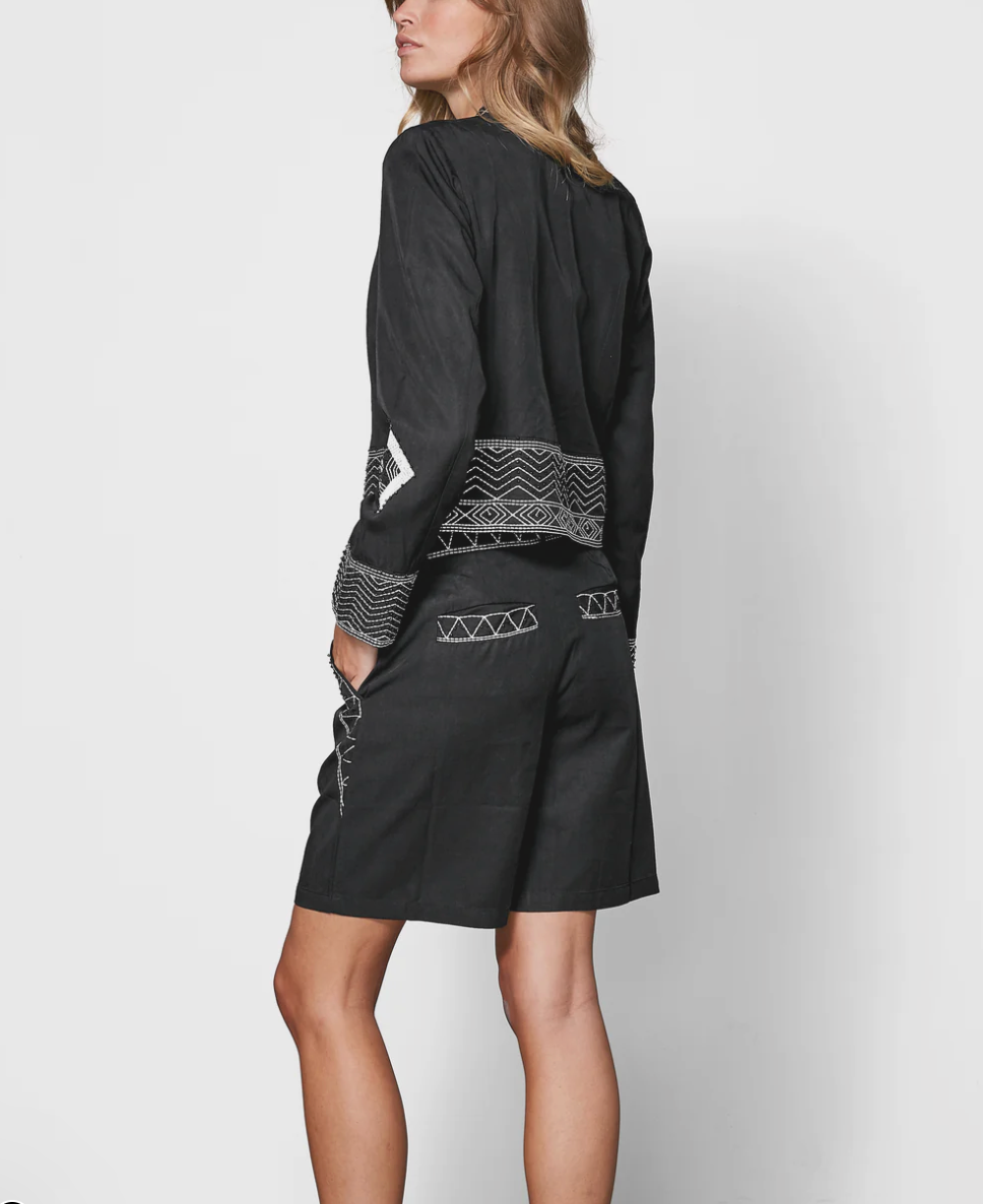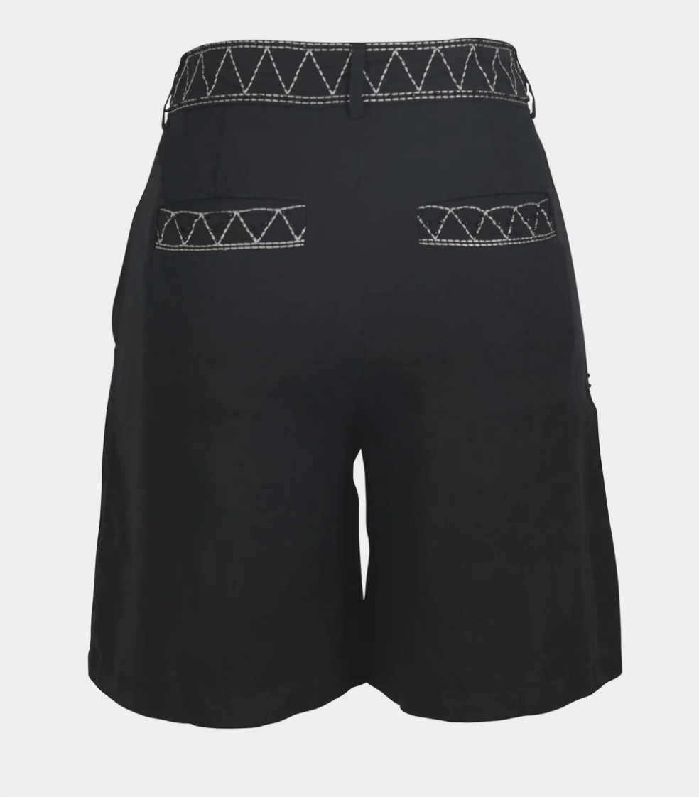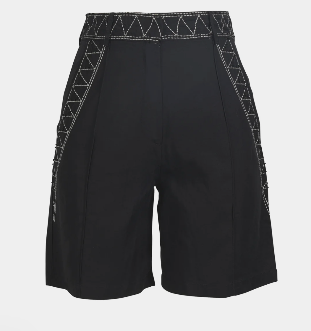 These shorts feature a classic fit with straight legs and fine embroidered details along the waistband, pockets, and sides. The graphic stitching pattern combined with sewn-on black beads adds a decorative element to the simple design, and the practical pockets provide both function and style.