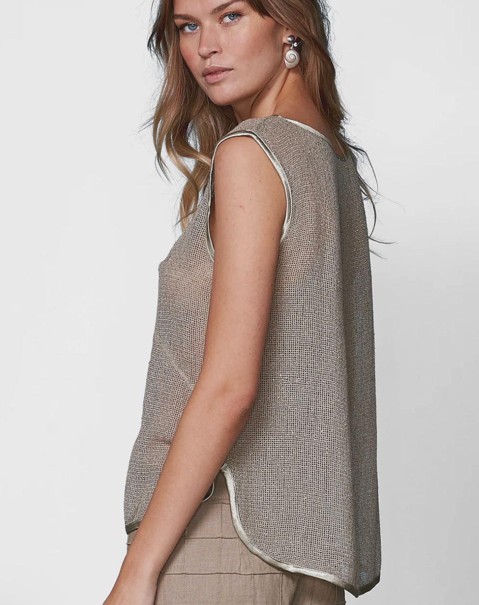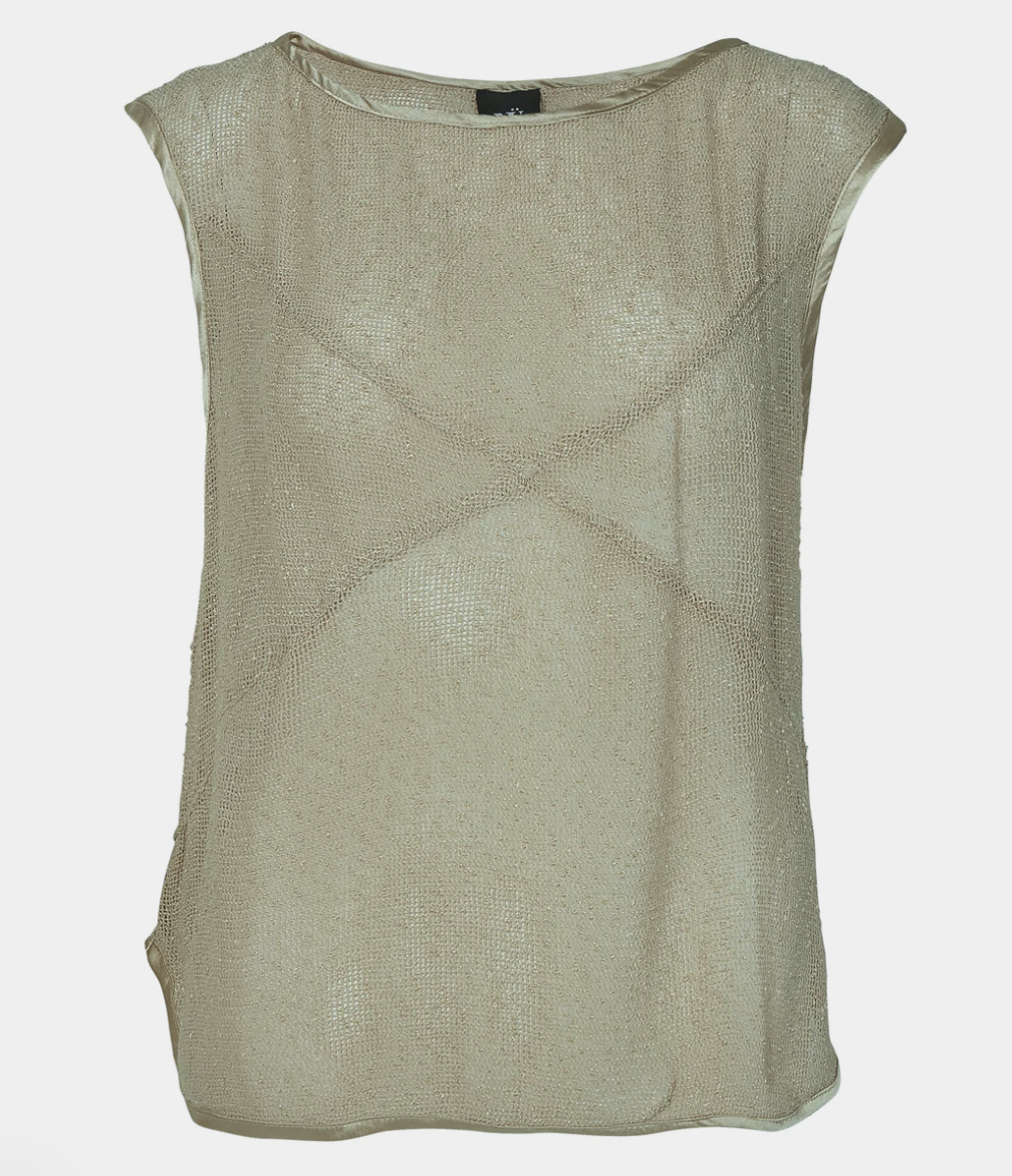 This top has a light transparent quality and a relaxed cut that gives an airy and elegant expression. The wide neckline and the delicate satin ribbons along the edge add a soft contrast to the structured surface. The discreet front seams create a flattering effect.