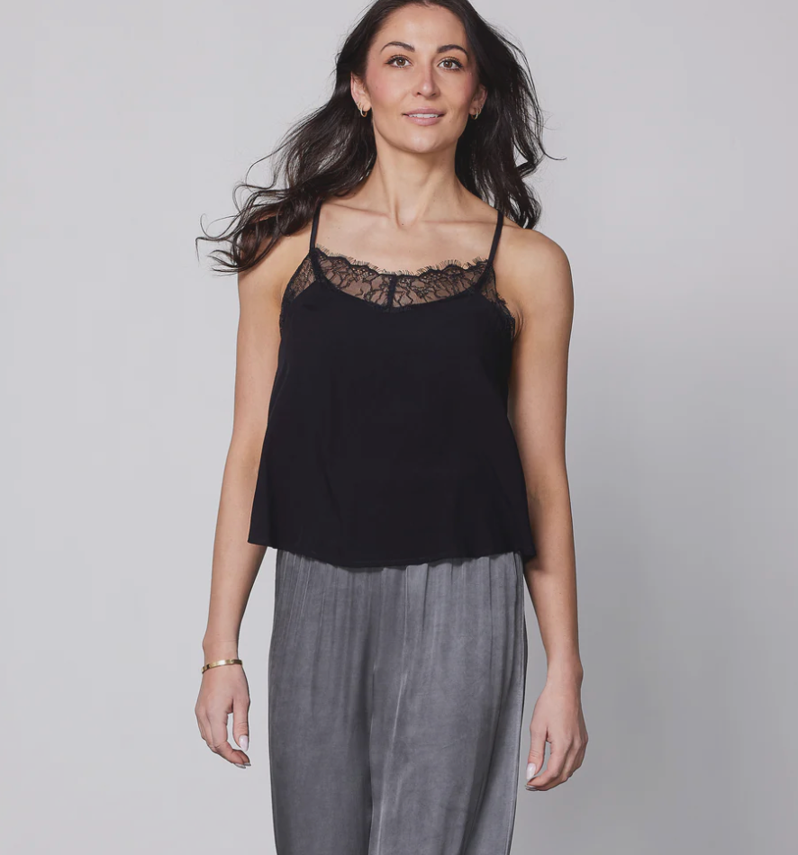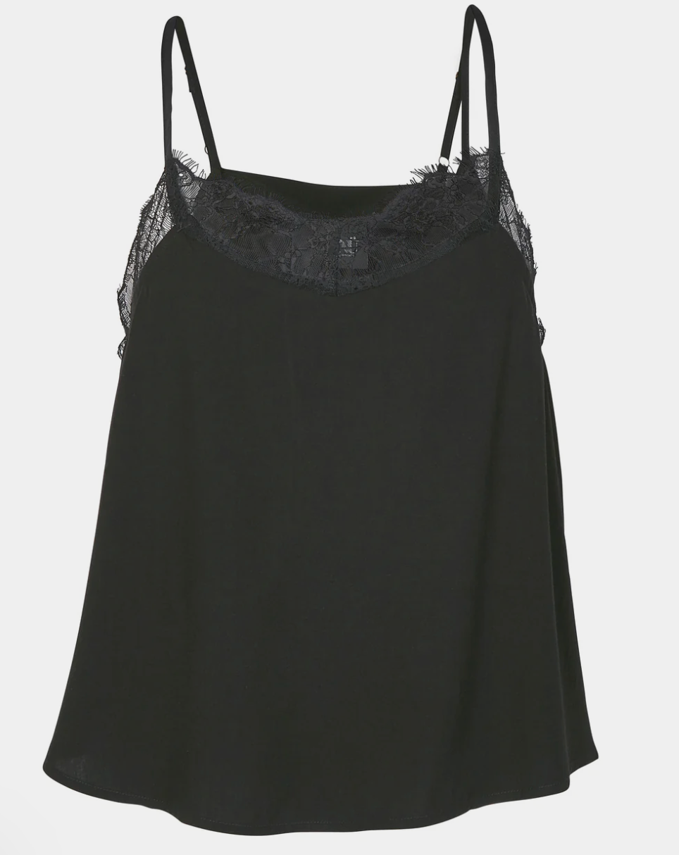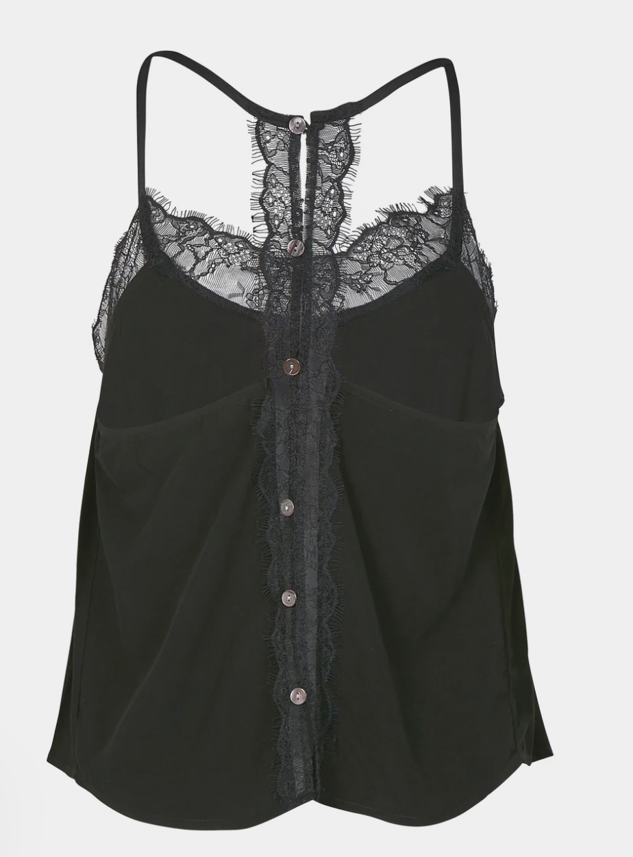 This top has an elegant and feminine expression with delicate lace details along the neckline and button closure at the back. It is made of a lightweight material with a loose fit that drapes nicely on the body. The thin straps and the rounded edge at the bottom complete the delicate design that can be worn for both everyday occasions and special events.