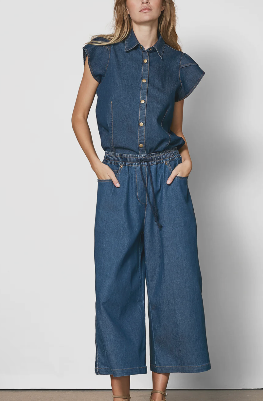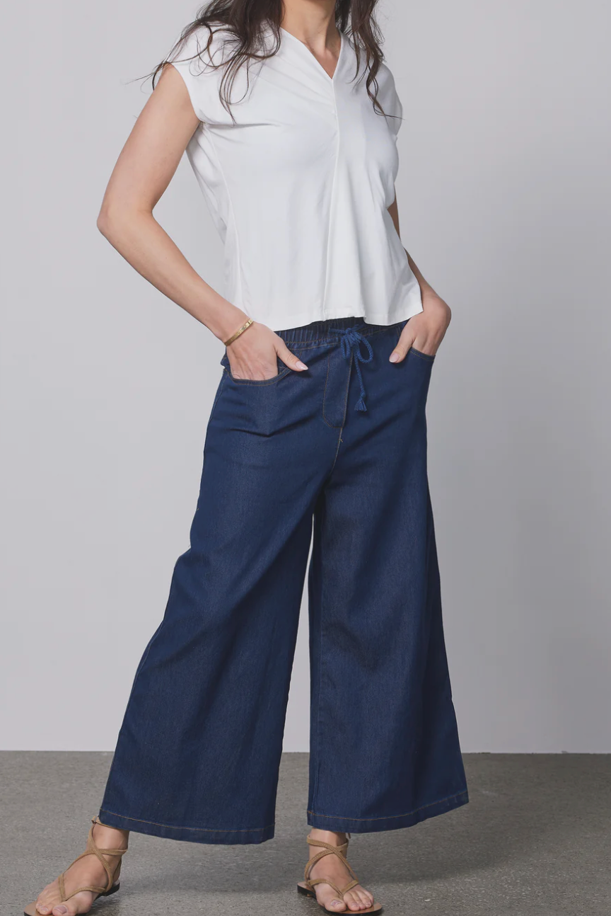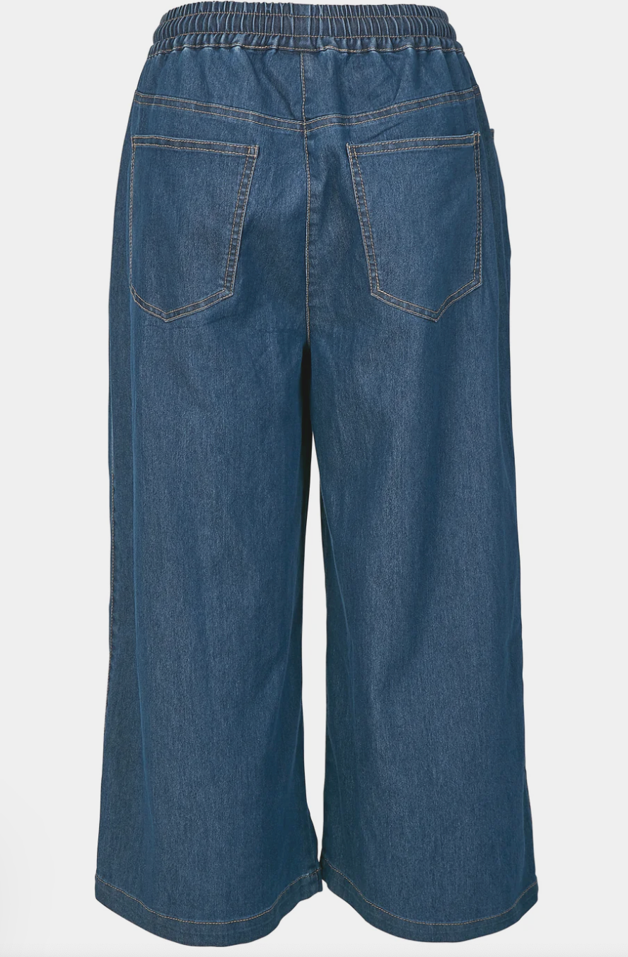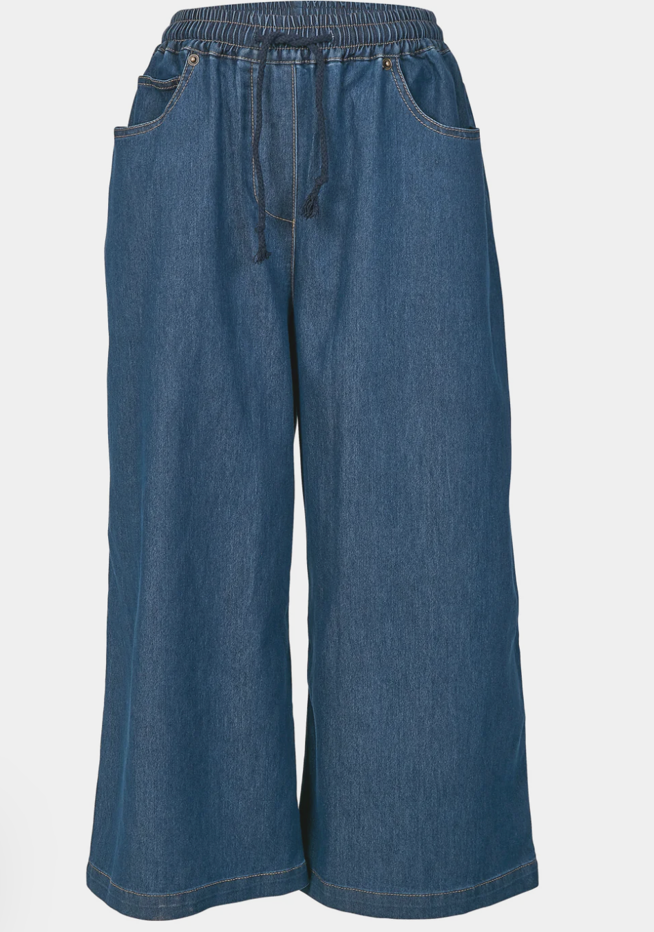 These pants have a relaxed fit with wide legs and a slightly cropped length, providing a modern and airy expression. They are made of soft denim and feature elastic and drawstring at the waist, making them comfortable to wear all day long. The pants have slant pockets at the front and two patch back pockets, adding a practical element to the simple design.