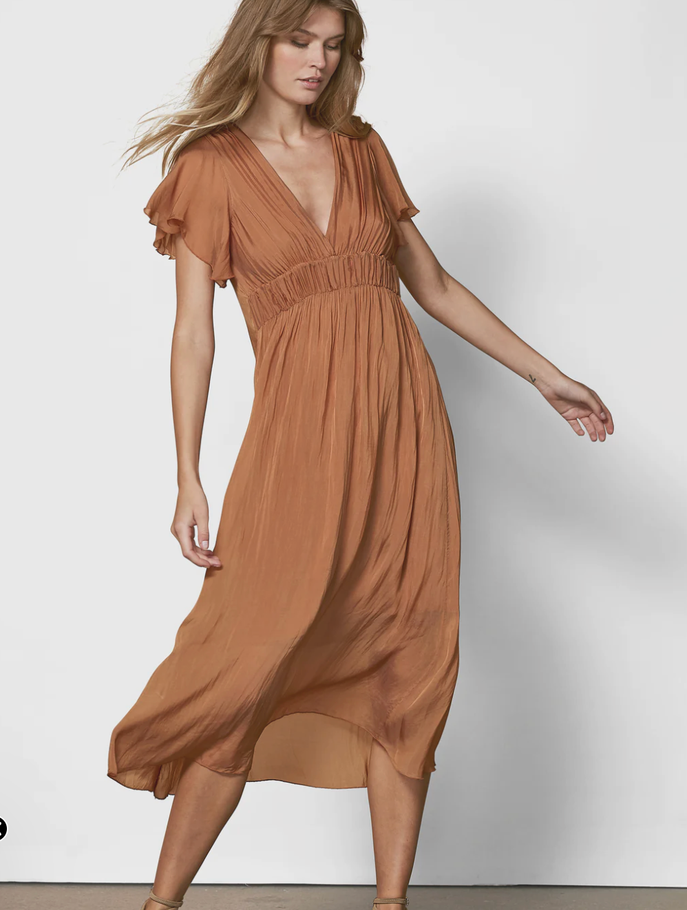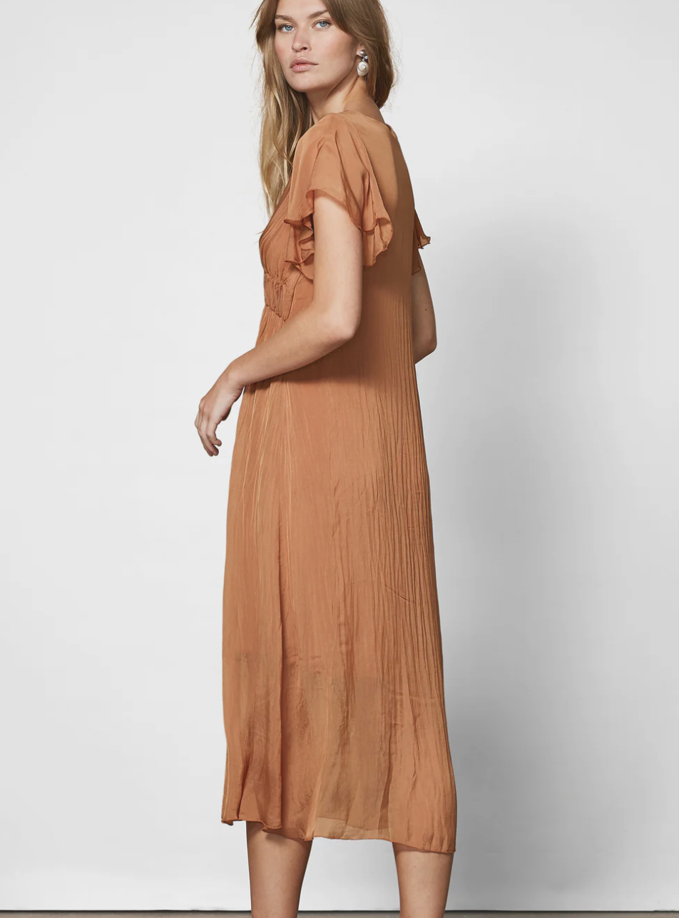 This dress has a light and airy expression with a V-neckline and short, fluttering sleeves that create a feminine silhouette. The defined elastic at the waist provides shape and emphasizes the long fall of the light, sheer material. The bottom part is lined, ensuring comfort and coverage.