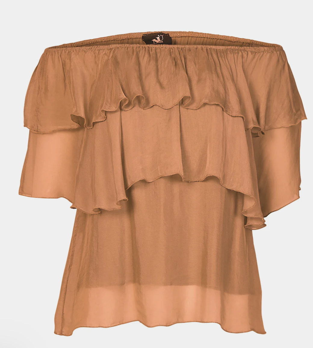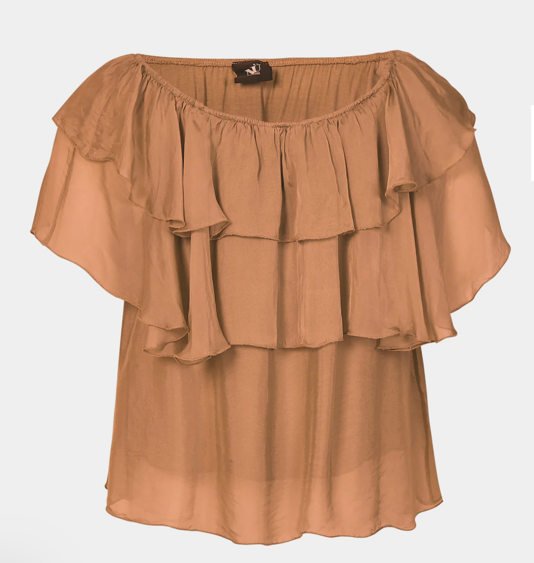 This top has an airy and feminine silhouette with wide ruffle details over the shoulders and chest. It is designed with elastic along the round neckline, allowing it to be worn both on and off the shoulders. The lightweight, transparent material drapes softly, creating an elegant expression.