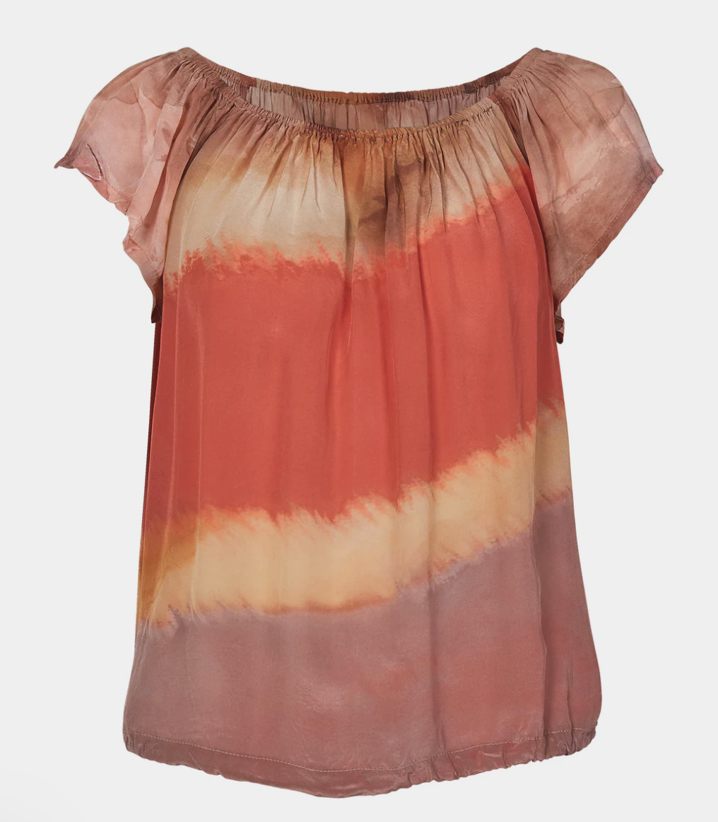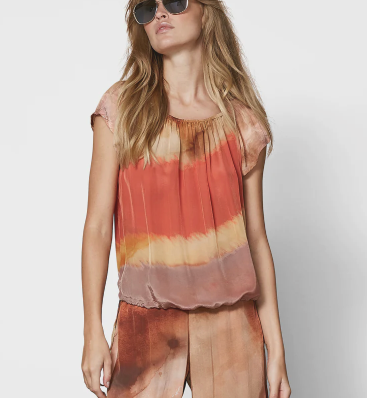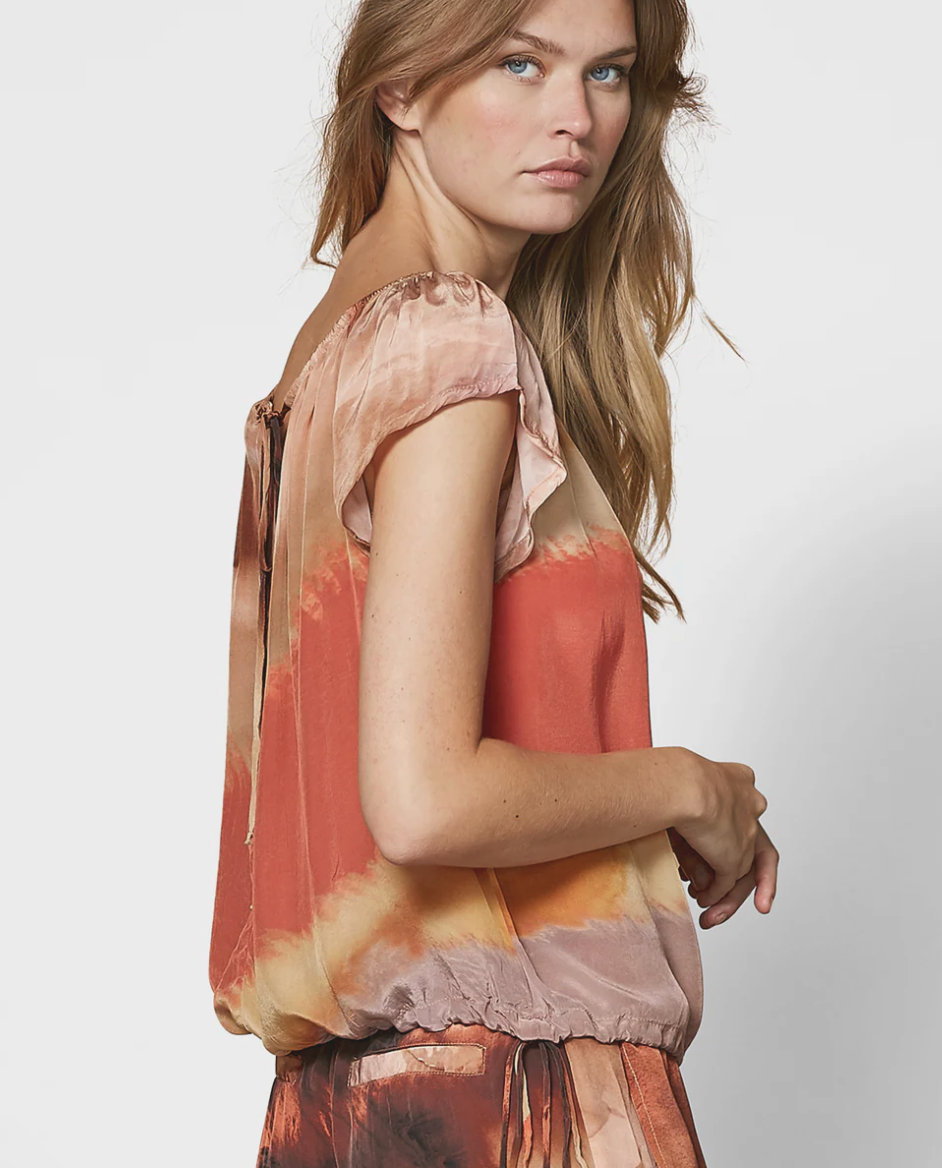 This top has a loose and airy fit with short, slightly transparent sleeves and a ruched elastic edge at the neckline. The soft folds create a feminine drape, while front and side ties add delicate details and the option for adjustment. The colorful print creates a lively and summery expression.