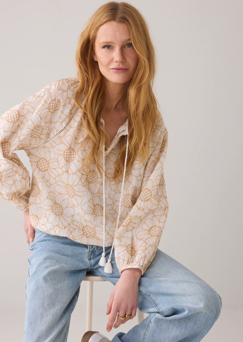This top has long balloon sleeves and is made of an embroidered cotton fabric with an all-over floral pattern. The wide round neckline with slit is finished with a drawstring and tassels and the sleeve hem is openwork with lace trim.