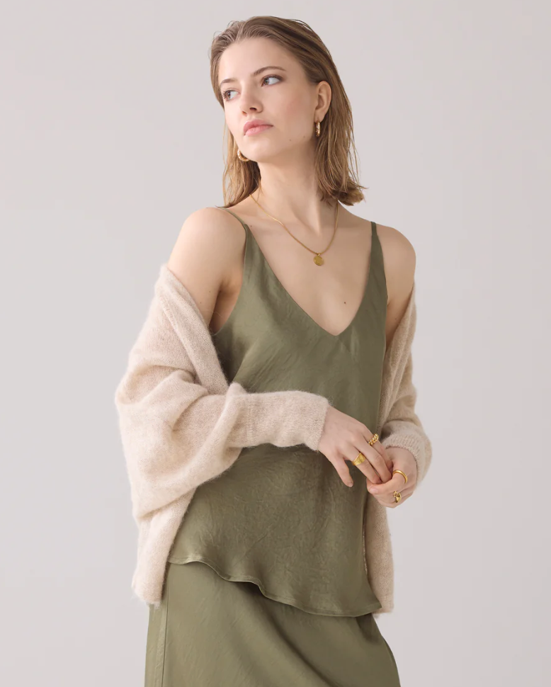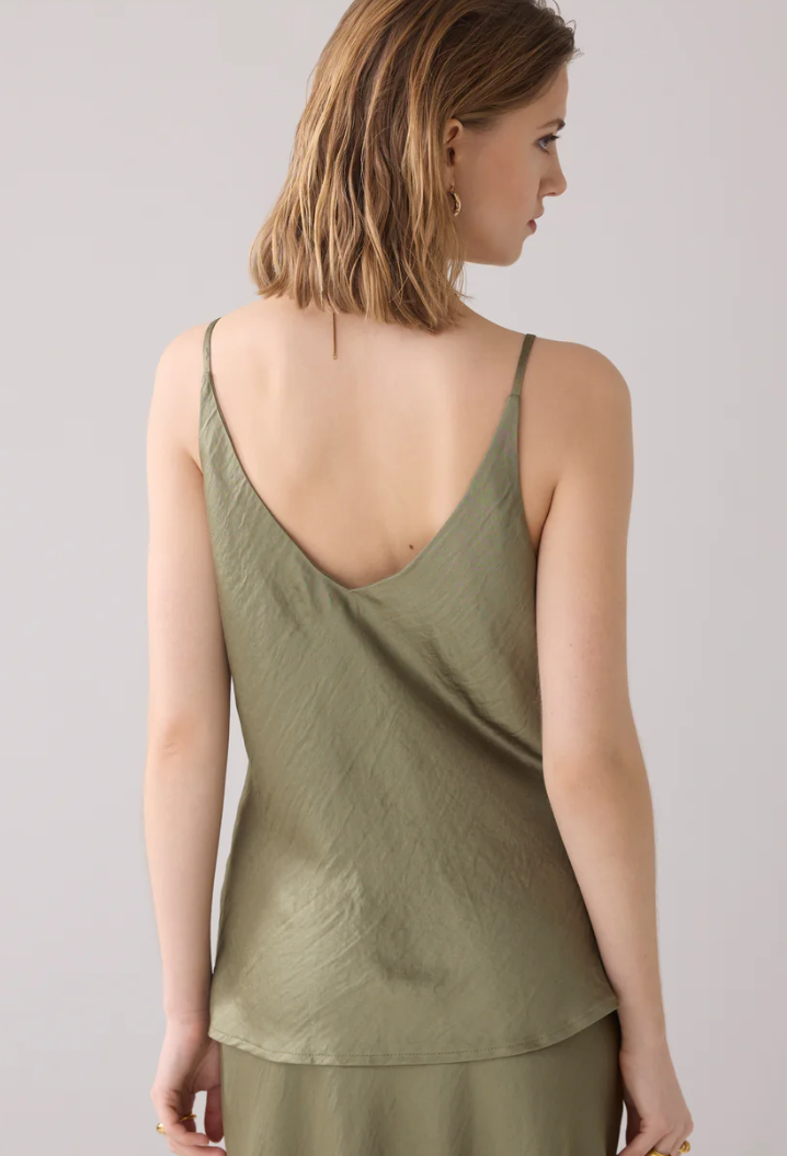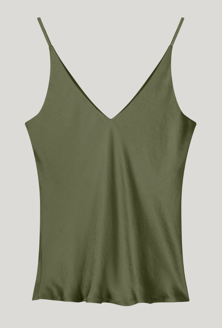 This singlet has a bias cut design that provides natural drape around your body. The top is made of a high-quality satin-look fabric and has non-adjustable spaghetti straps.