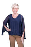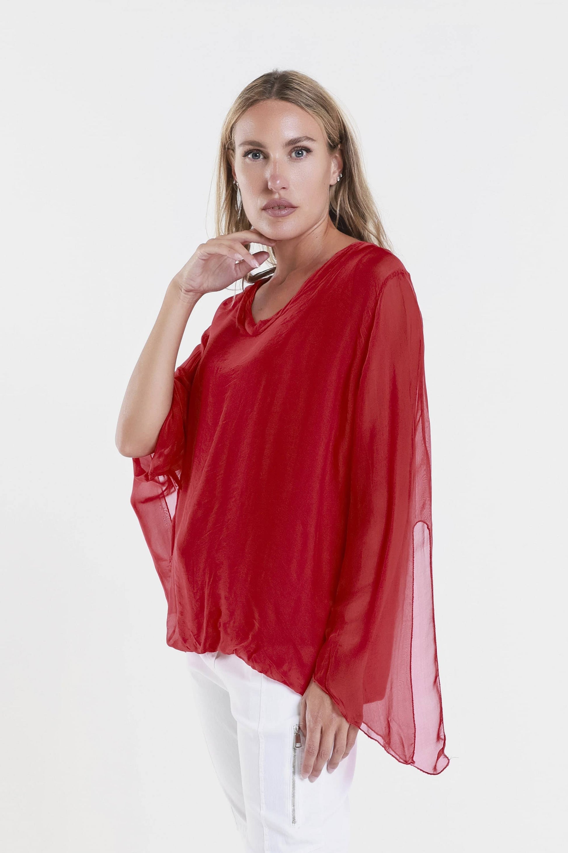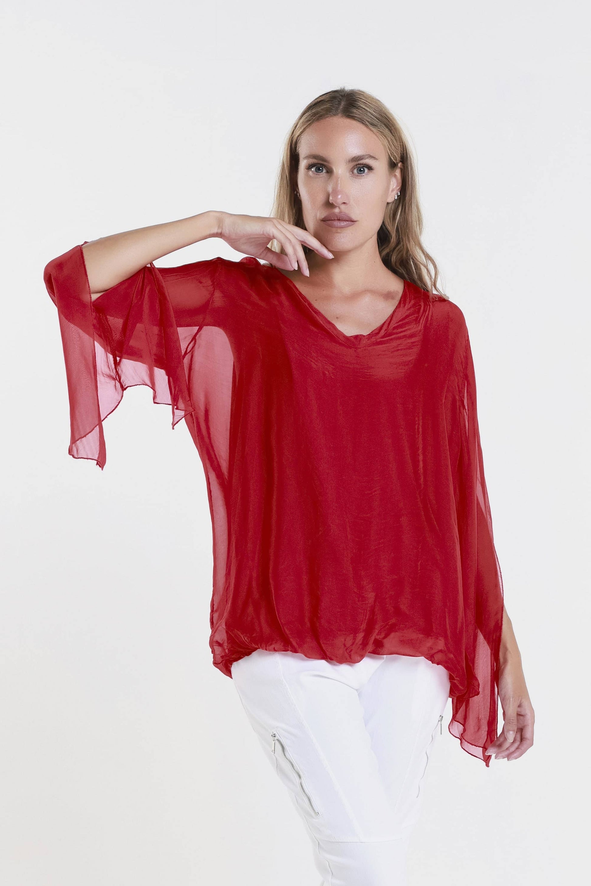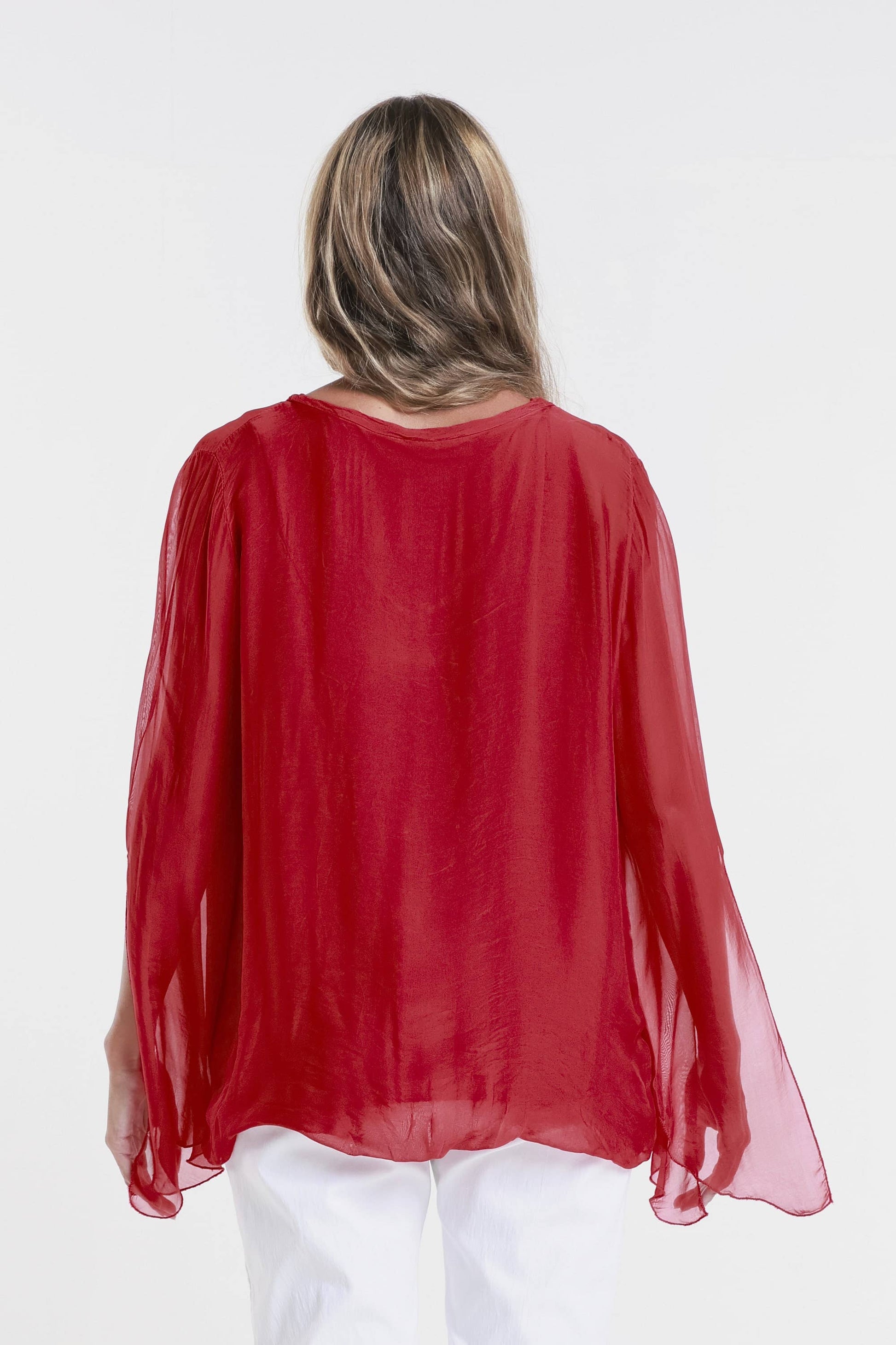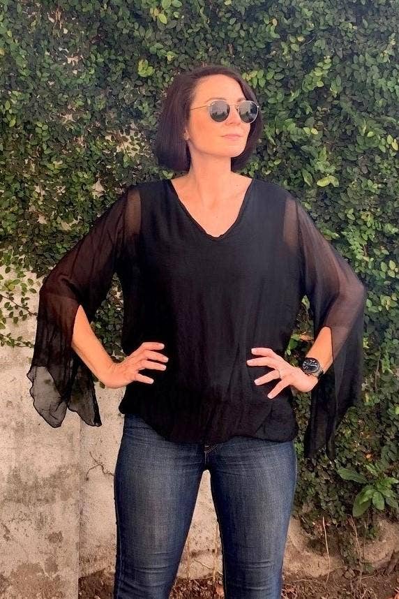 Meet Tiffany; another fabulous silk blouse that gives you options! The long sheer sleeve splits open at the elbow for a flutter effect. If you want a more polished look, simply tie the ends for a sophisticated detail at the wrist. You’ll feel confident and comfy in this silk top with buttery soft lining underneath. Easily dress her up with a more luxe, fitted pant or down with your favorite jeans. Made in Italy. • V-Neckline • Convertible sleeves – flutter or tie! • Easy bloused effect to the hip • One size fits most (REALLY!) *2 – 12/14 • Machine wash cold, delicate, with like colors. Lingerie bag recommended. Hang or lay flat to dry.