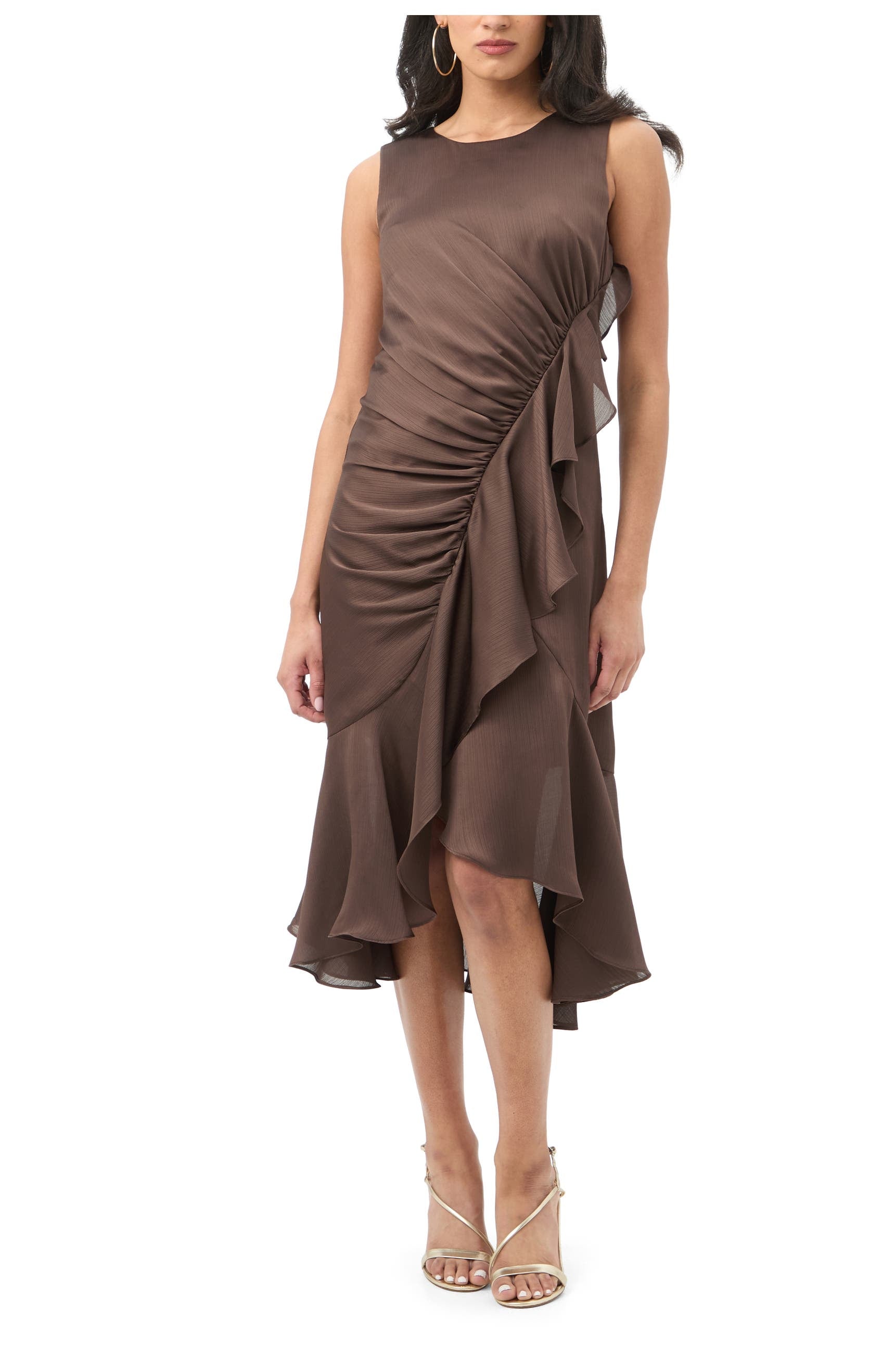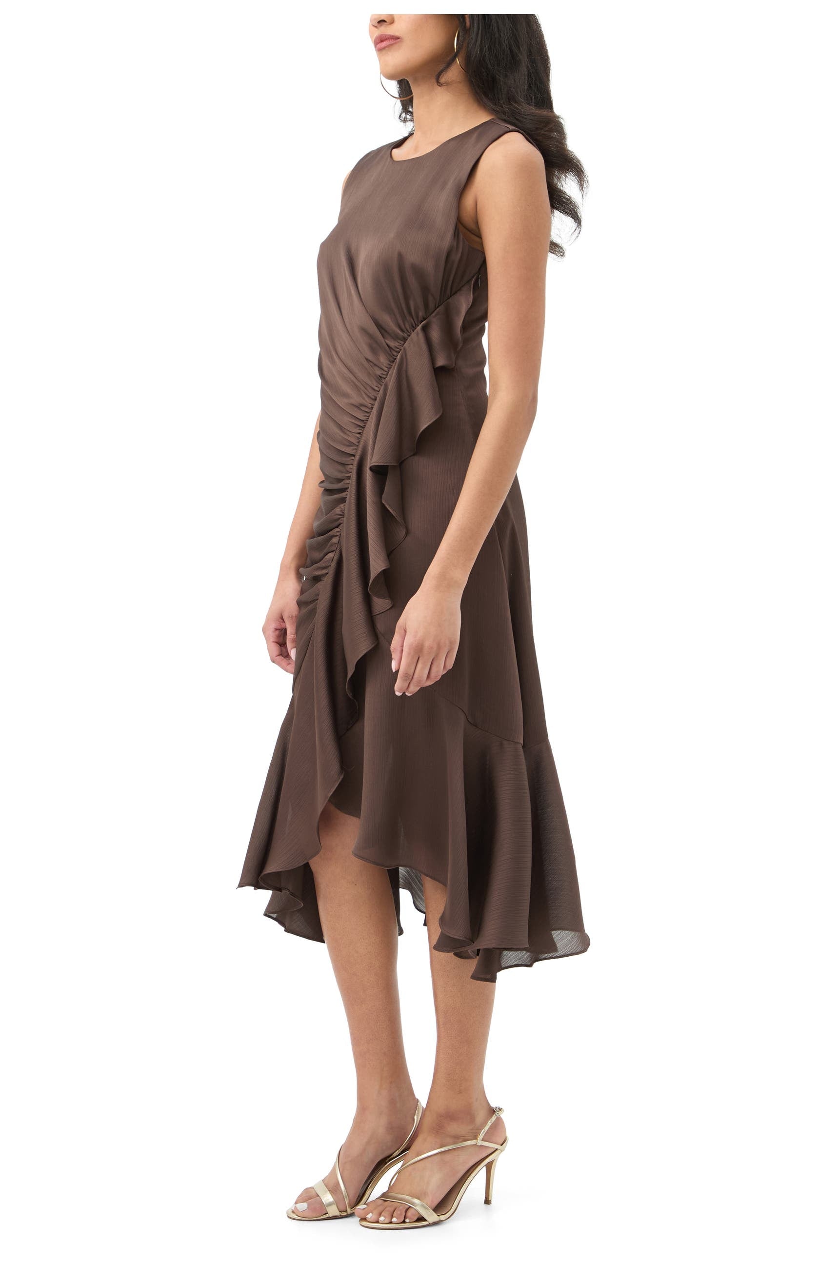 Midi length cocktail dress in crinkle georgette with a high low hem and asymmetrical ruching and ruffle detail