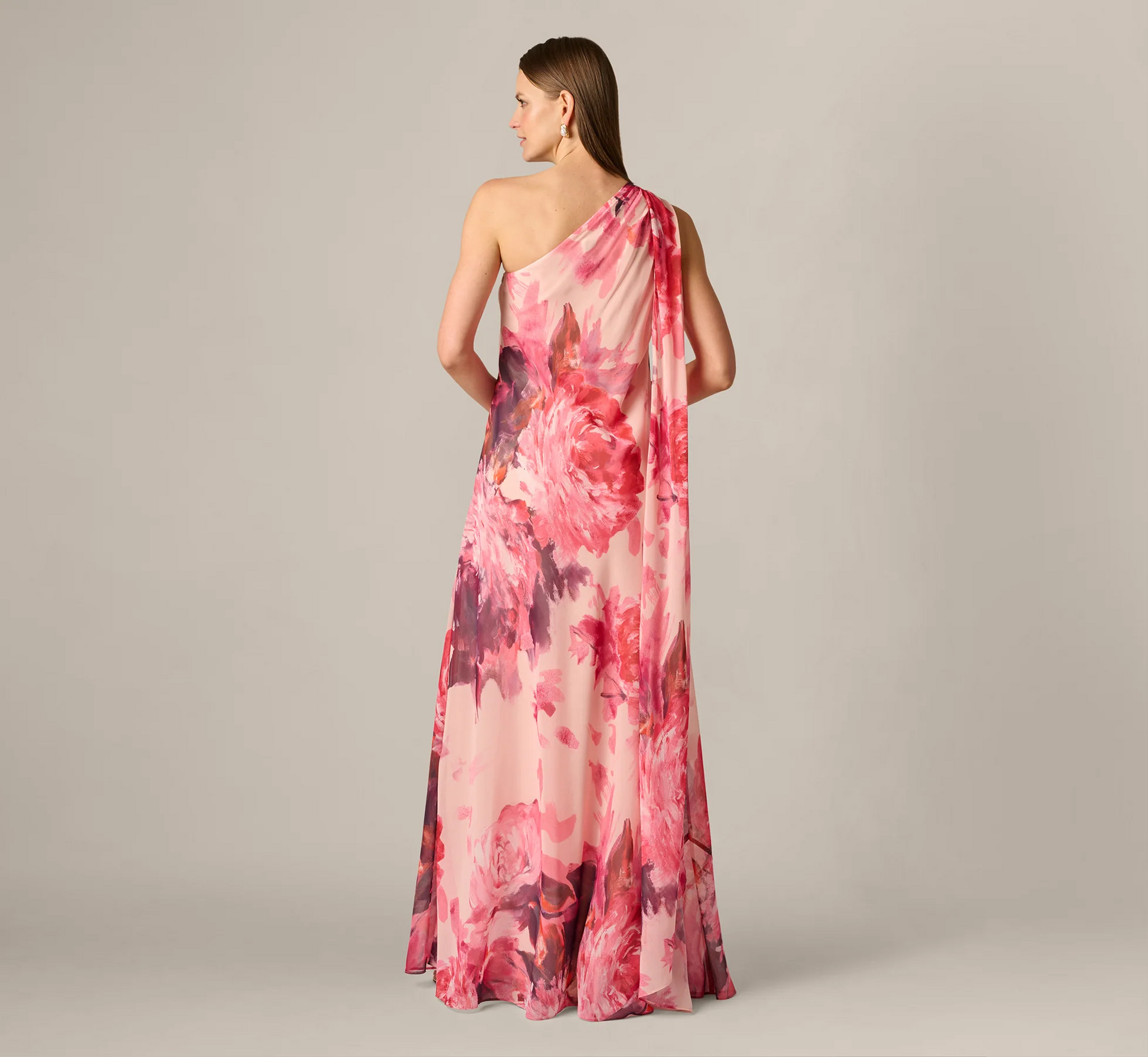 Effortlessly ethereal, this one shoulder evening gown is designed in airy chiffon fabric printed with an impressionistic peony floral motif. The flowing silhouette lends graceful movement, contrasting with the golden hardware accent securing the asymmetrical neckline. A trailing scarf detail cascades down the back, adding an element of modern drama. Airy yet elegant, this gown will make a refined statement at warm weather celebrations and formal events.