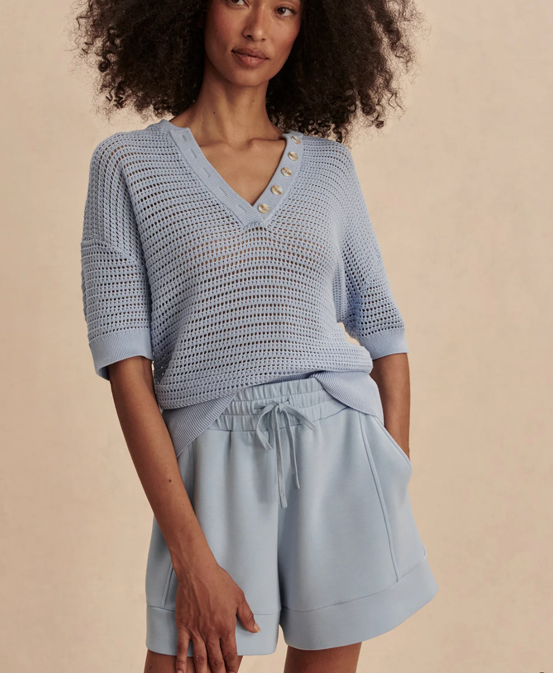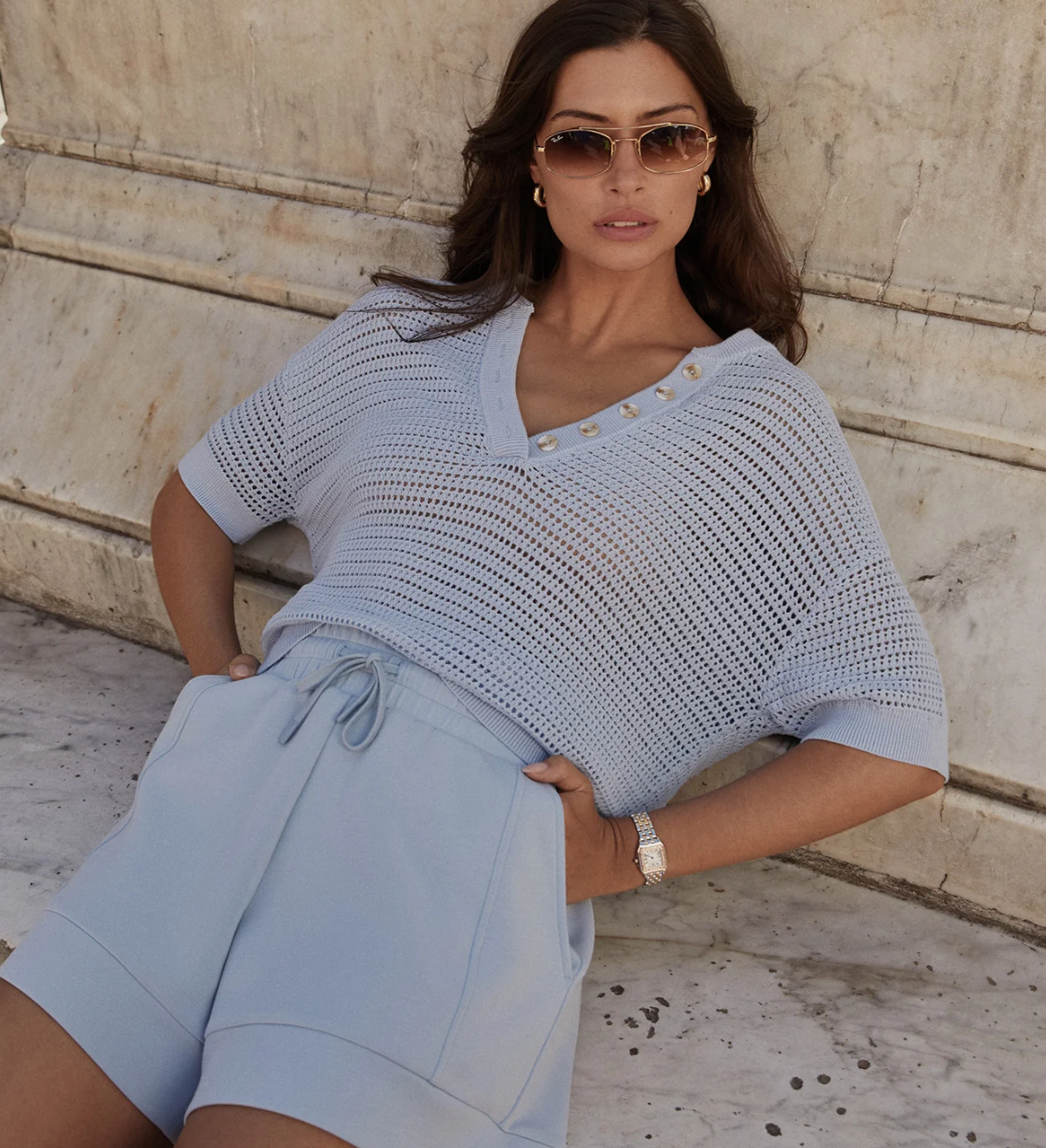 Crafted in our lightweight cotton mesh knit to a boxy, oversized silhouette, this top hangs elegantly off the frame with a deep V-neckline. Featuring short sleeves with dropped shoulders for a more relaxed fit, style with everything from active sets to everyday staples.
