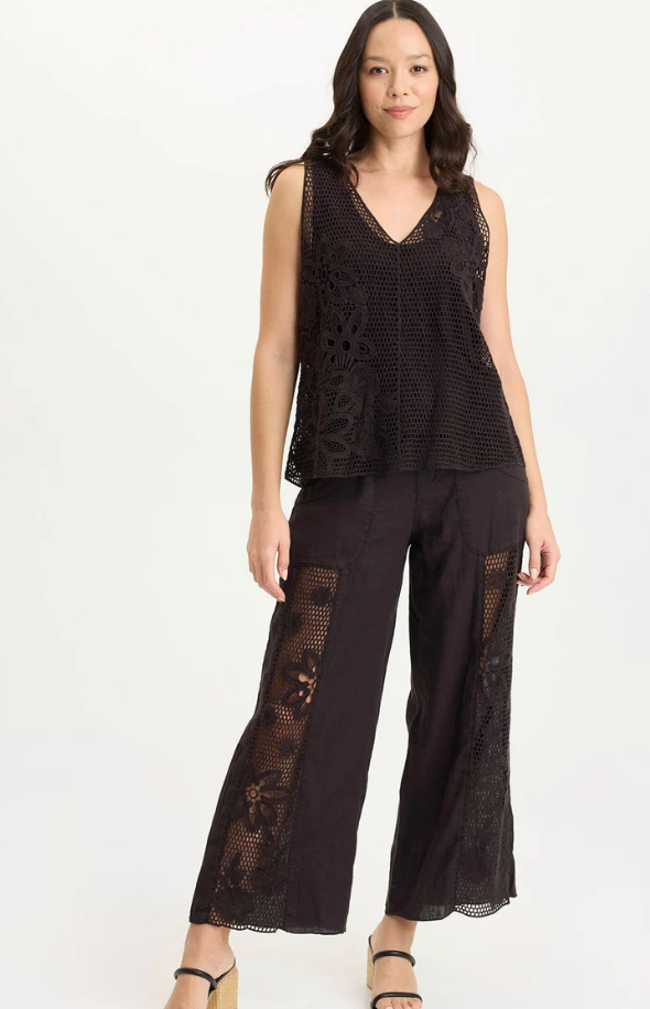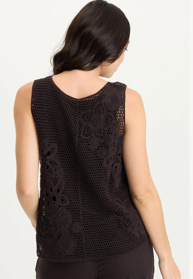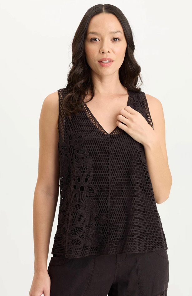 Lined mesh and floral crochet tank with a v-neckline and an a-line silhouette.