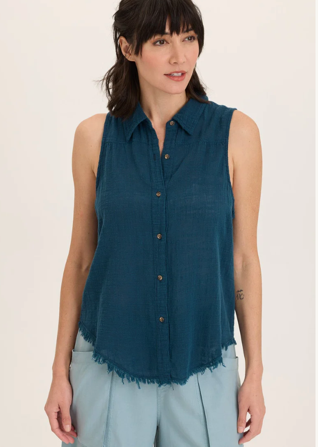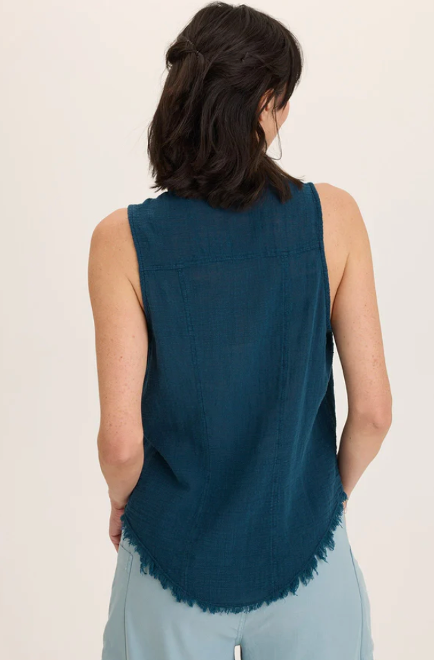 A traditional button-up style tank with a front and back yoke paired with raw edge details, made in our breezy cotton gauze.